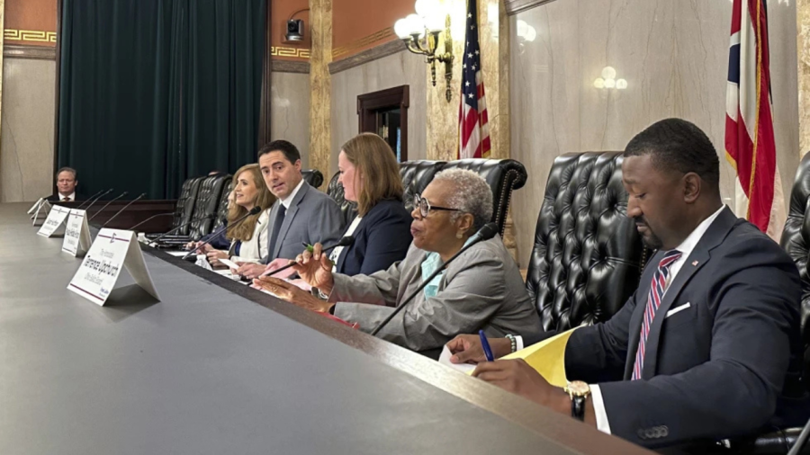 Members of the Ohio Ballot Board convene at the Ohio Statehouse in Columbus, Ohio, Aug. 16, 2024, to consider language for a fall redistricting amendment. (AP Photo/Julie Carr Smyth)