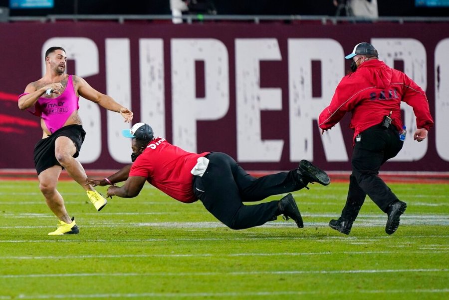 Security tries to grab a fan on the field during the second half of the NFL Super Bowl 55 football game between the Tampa Bay Buccaneers and the Kansas City Chiefs, Sunday, Feb. 7, 2021, in Tampa, Fla. (AP Photo/Mark Humphrey)