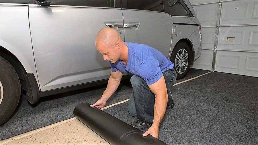 Rubber, plastic, or vinyl: These tough, non-porous materials are popular options for car garage mats because they’re durable and easy to clean. Rather than absorbing liquids, they repel them. For that reason, many have rolled edges to trap liquids until they can be cleaned up with a mop or a wet/dry shop vac.
