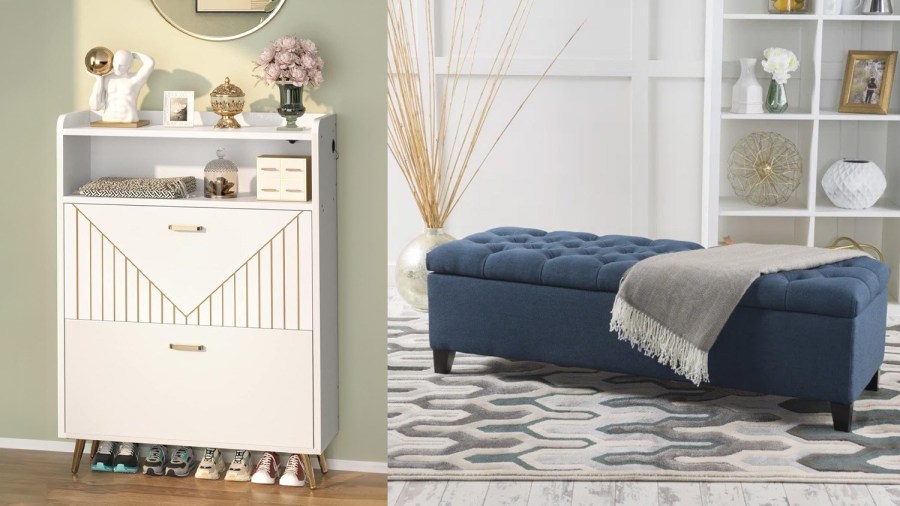 - Furniture with built-in storage: Benches, chairs, footstools — there are various types of furniture that have integrated storage space where you could keep clothes. You can also buy beds with built-in storage, although that’s a big purchase unless you’re looking to get a new bed frame anyway.