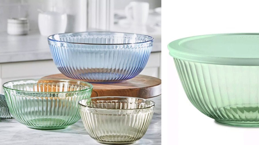 In this article: Pyrex Sculpted Tint 2qt Lidded Mixing Bowl in Green, Pyrex Sculpted Tint 2qt Lidded Mixing Bowl in Yellow and Pyrex Simply Store Tinted 6pc Lidded Round Storage Set in Blue