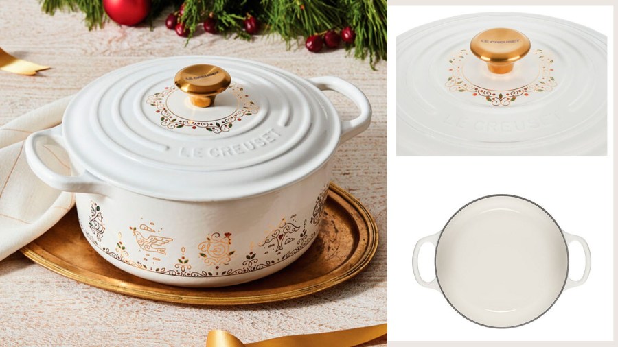Le Creuset’s iconic enameled-cast-iron Dutch oven gets a holiday makeover in a ”12 Days of Christmas” theme for the Noël Collection. Designed in white glaze with intricate gold scrollwork depicting the 12 days in the famed carol, this versatile Dutch oven will make the perfect addition to your table this year.