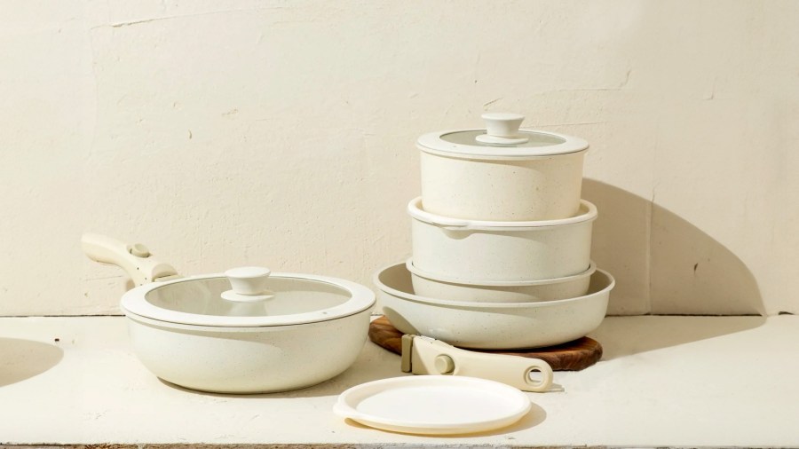 This set from Drew Barrymore’s line is gorgeous and affordable. It comes with two frying pans, one saute pan, one saucepan, a Dutch oven and four protectors for storing your cookware.