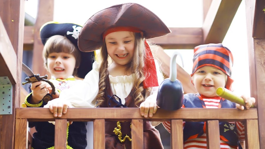 This five-piece set includes a pirate skull mask, a sword and dagger, a flintlock pistol and a compass. When Halloween is over, your children can continue to play with the set’s pieces.