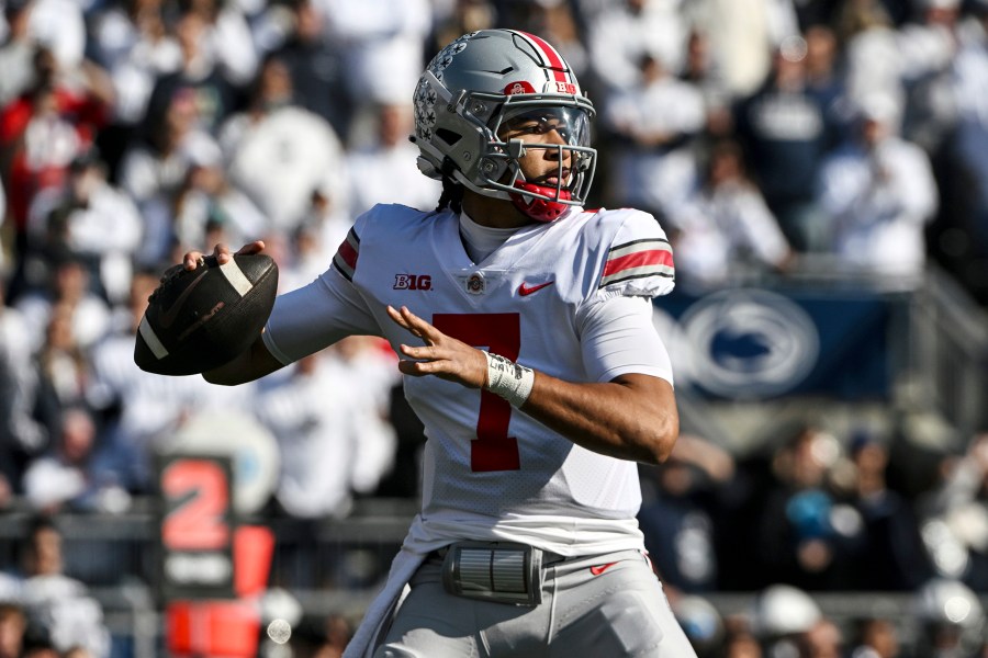 Ohio State quarterback C.J. Stroud (7) throws a pass against Penn State during the first half of an NCAA college football game, Saturday, Oct. 29, 2022, in State College, Pa. (AP Photo/Barry Reeger)