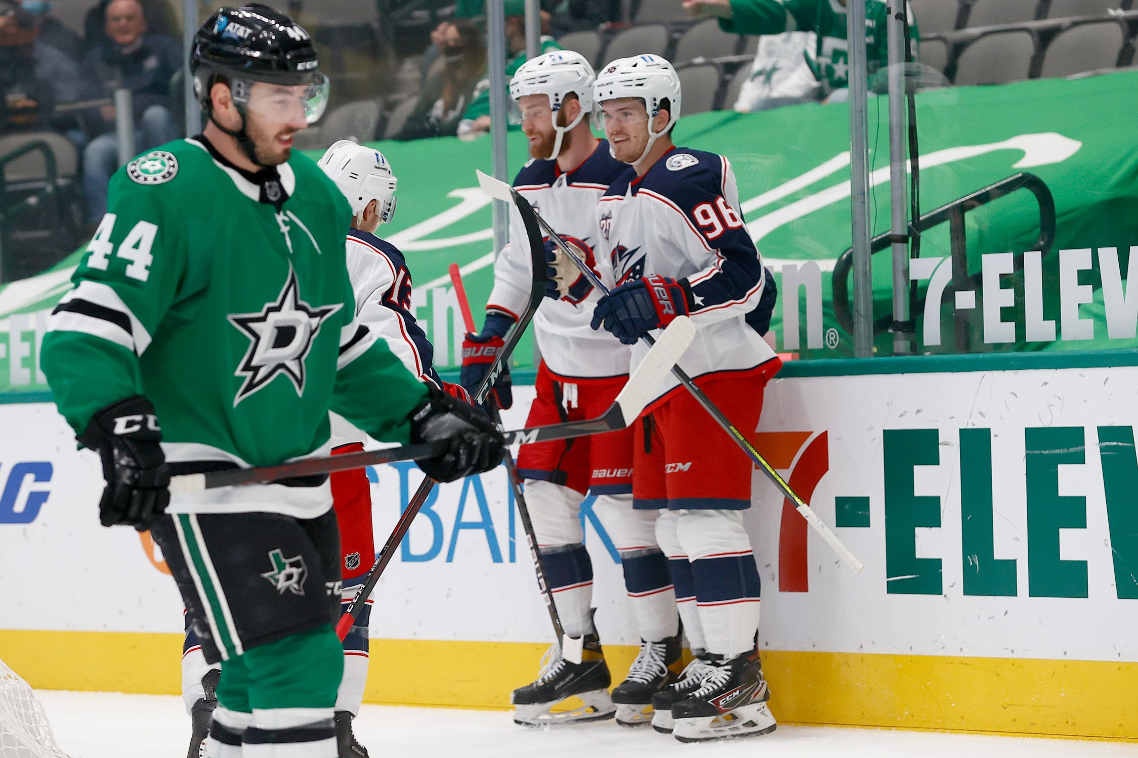 DALLAS, TEXAS – APRIL 15: Jack Roslovic #96 of the Columbus Blue Jackets scores a goal against Jake Oettinger #29 of the Dallas Stars in the first period at American Airlines Center on April 15, 2021 in Dallas, Texas. (Photo by Tom Pennington/Getty Images)