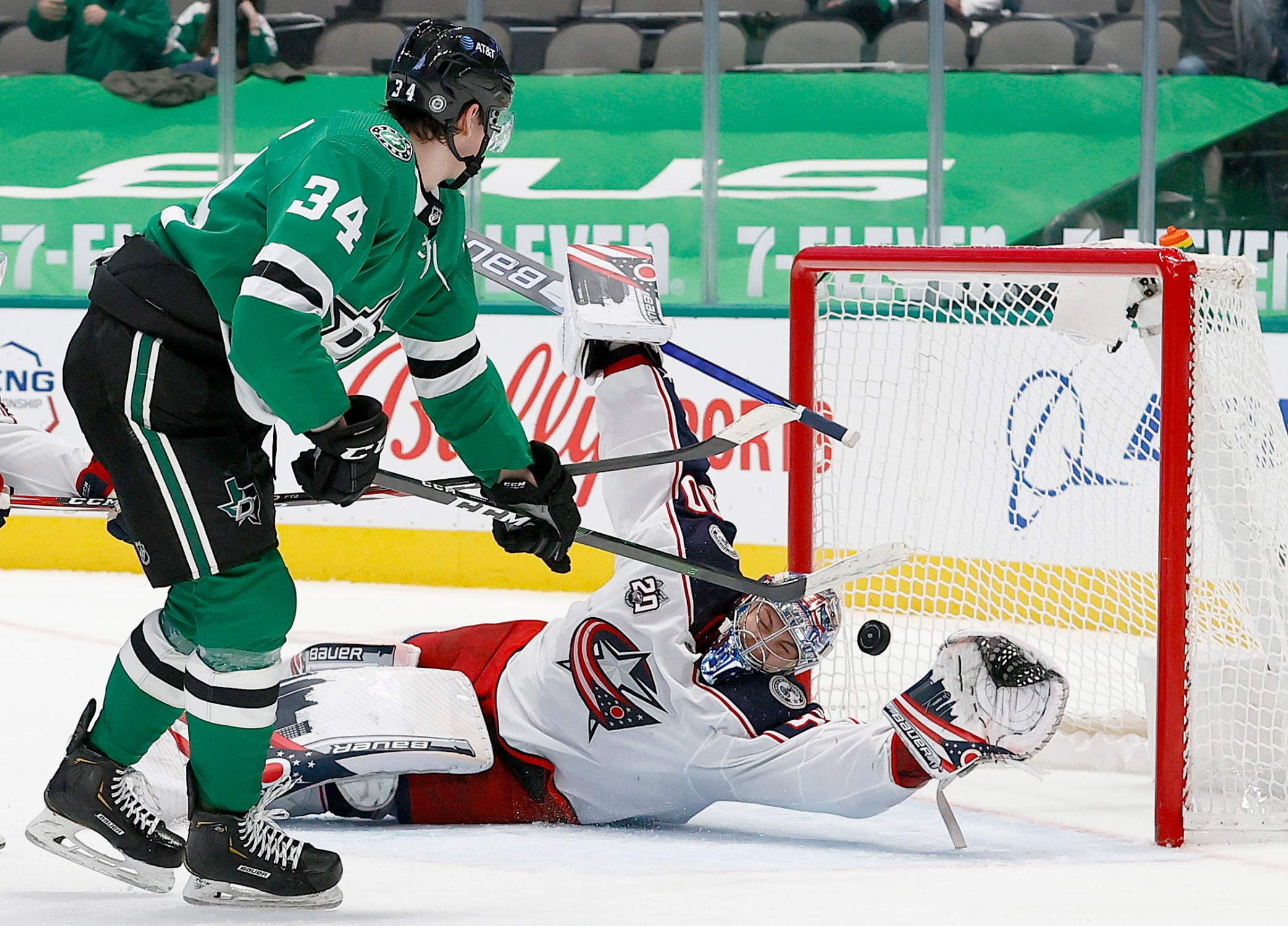 DALLAS, TEXAS - APRIL 15: Denis Gurianov #34 of the Dallas Stars scores a goal against Elvis Merzlikins #90 of the Columbus Blue Jackets in the second period at American Airlines Center on April 15, 2021 in Dallas, Texas. (Photo by Tom Pennington/Getty Images)