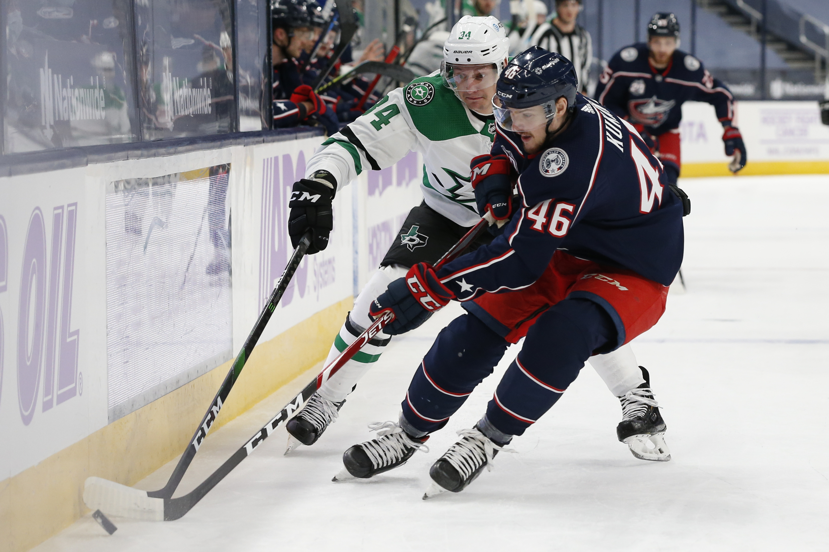 COLUMBUS, Ohio (WCMH) — The Columbus Blue Jackets outlasted the Dallas Stars 4-3 Thursday night in a game that featured the first goals by CBJ newcomers Jack Roslovic and Patrik Laine.