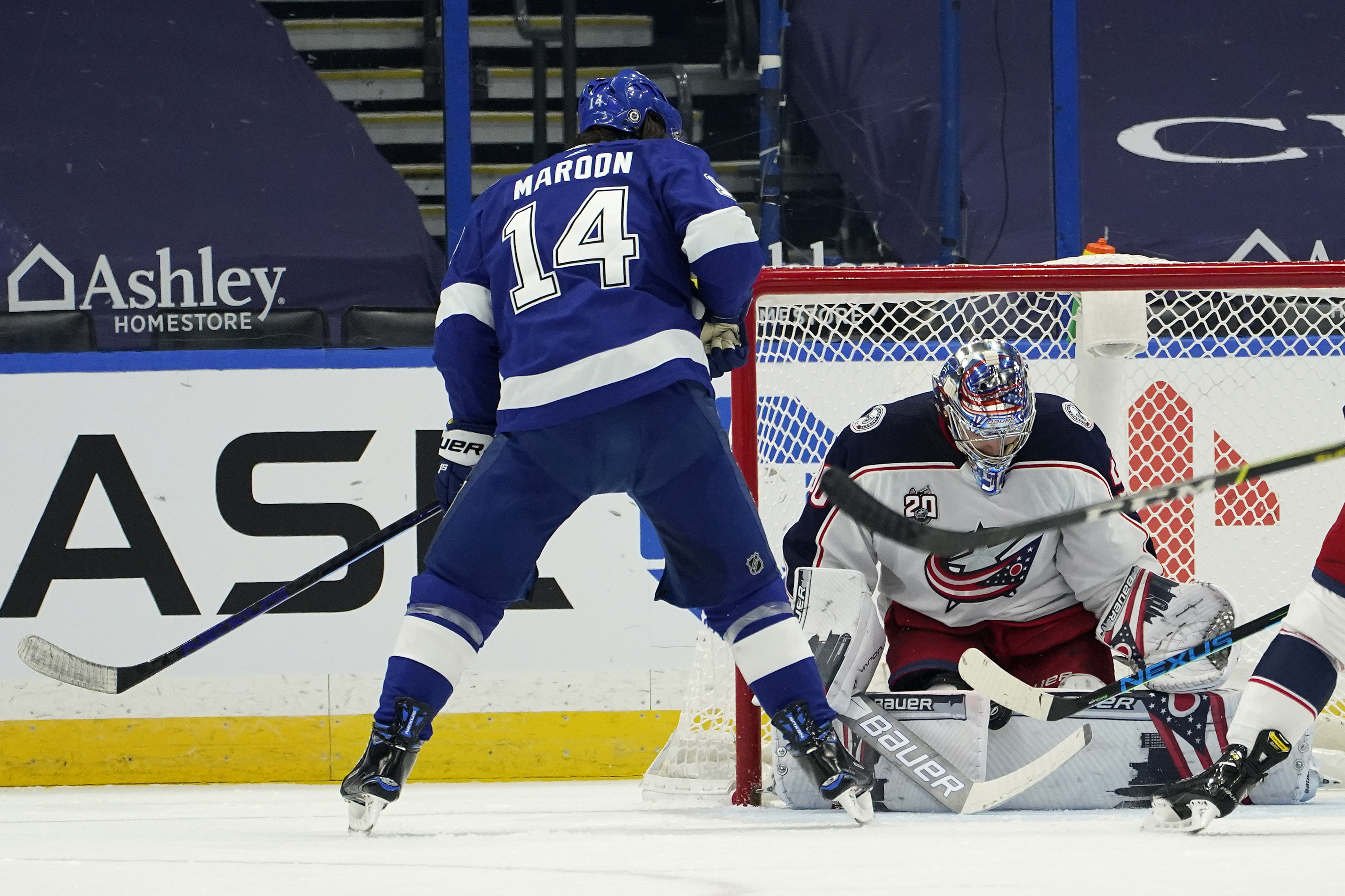 Tampa Bay Lightning left wing Pat Maroon (14) looks for a rebound as Columbus Blue Jackets goaltender Elvis Merzlikins (90) makes a pad save on a shot during the first period of an NHL hockey game Tuesday, March 30, 2021, in Tampa, Fla. (AP Photo/Chris O’Meara)