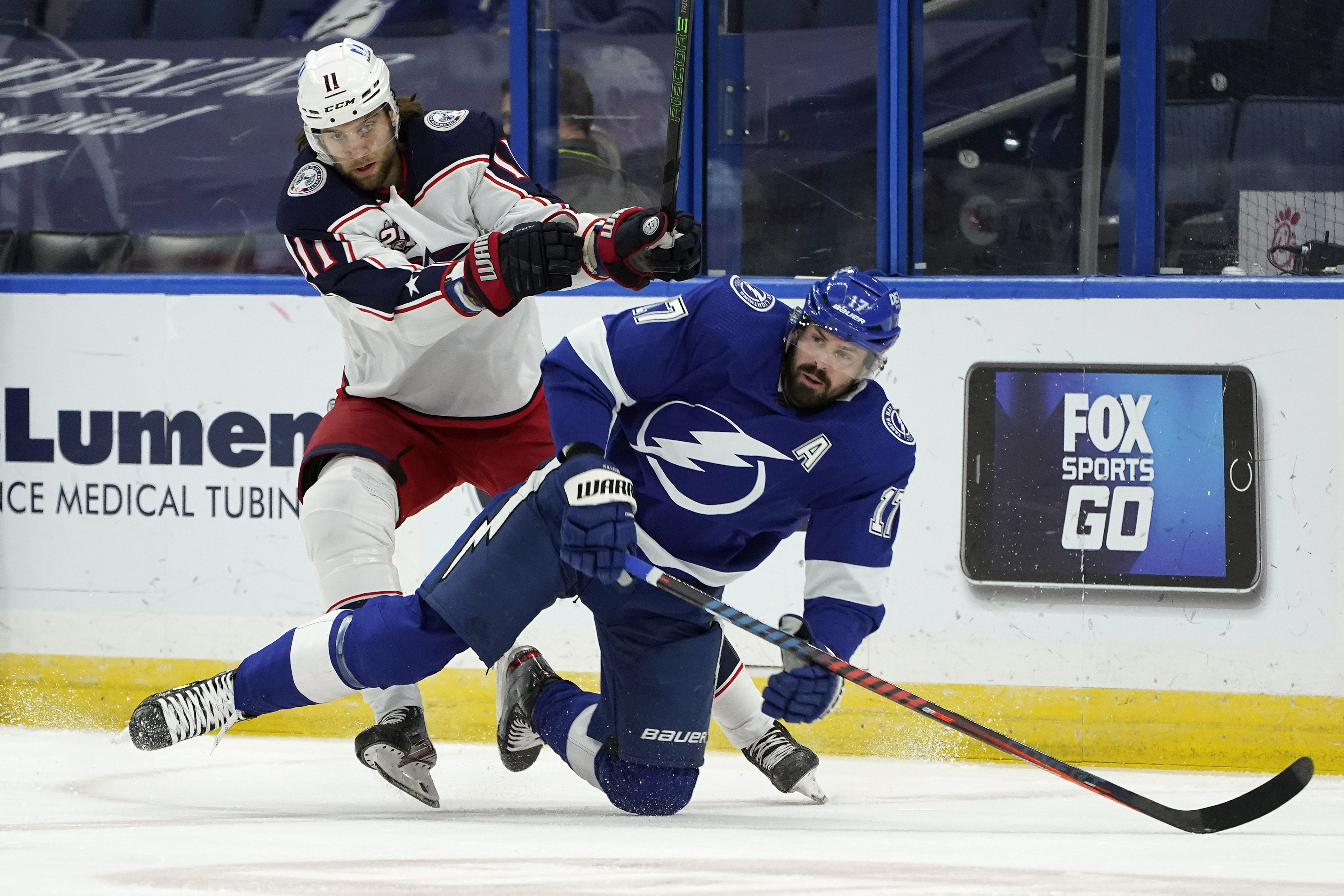 Columbus Blue Jackets center Kevin Stenlund (11) knocks down Tampa Bay Lightning left wing Alex Killorn (17) after a pass during the first period of an NHL hockey game Tuesday, March 30, 2021, in Tampa, Fla. (AP Photo/Chris O’Meara)