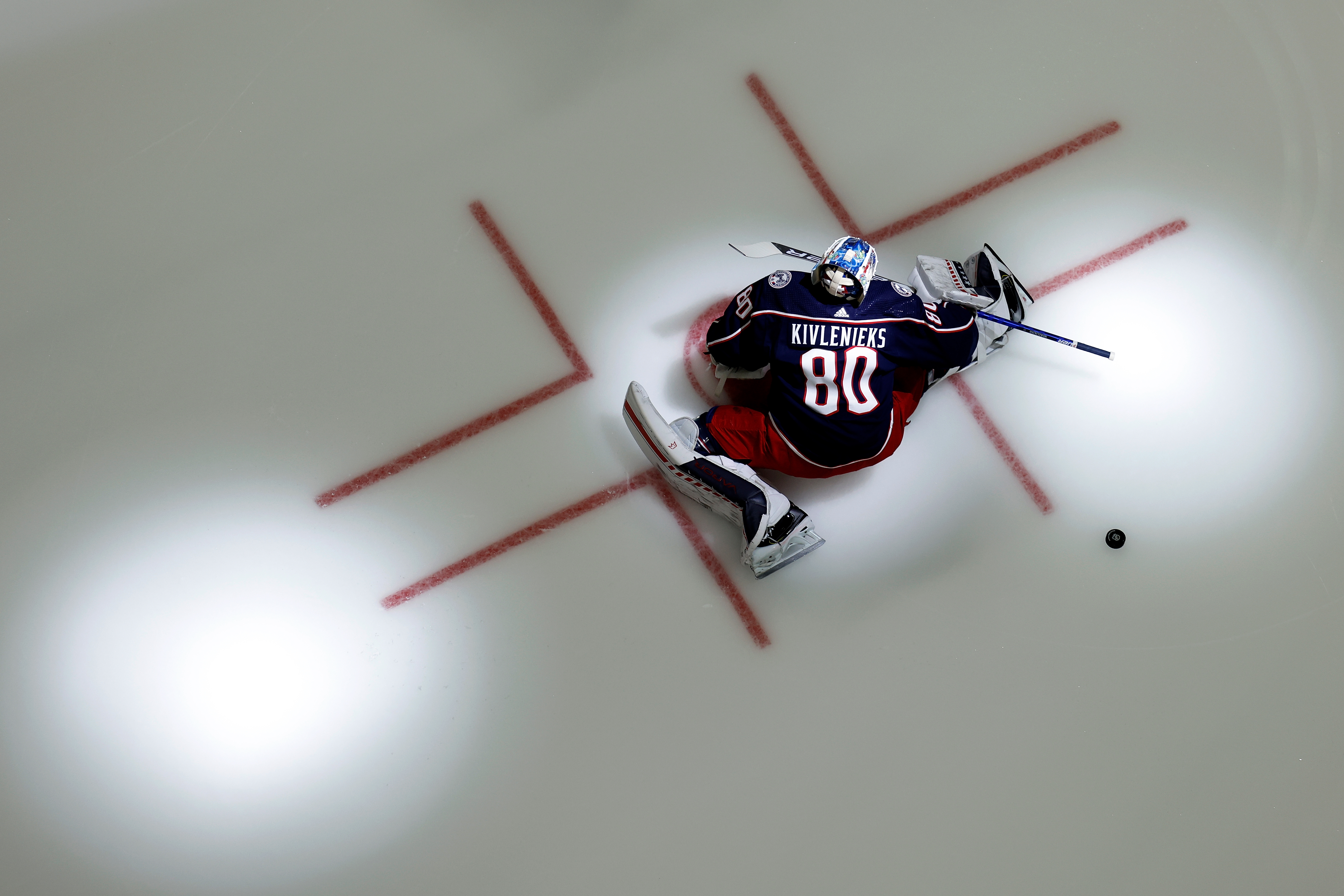 Goaltender Elvis Merzlikins turned in a solid first-game performance while wearing the No. 80 jersey of Matiss Kivlenieks who was memorialized prior to puck drop.
