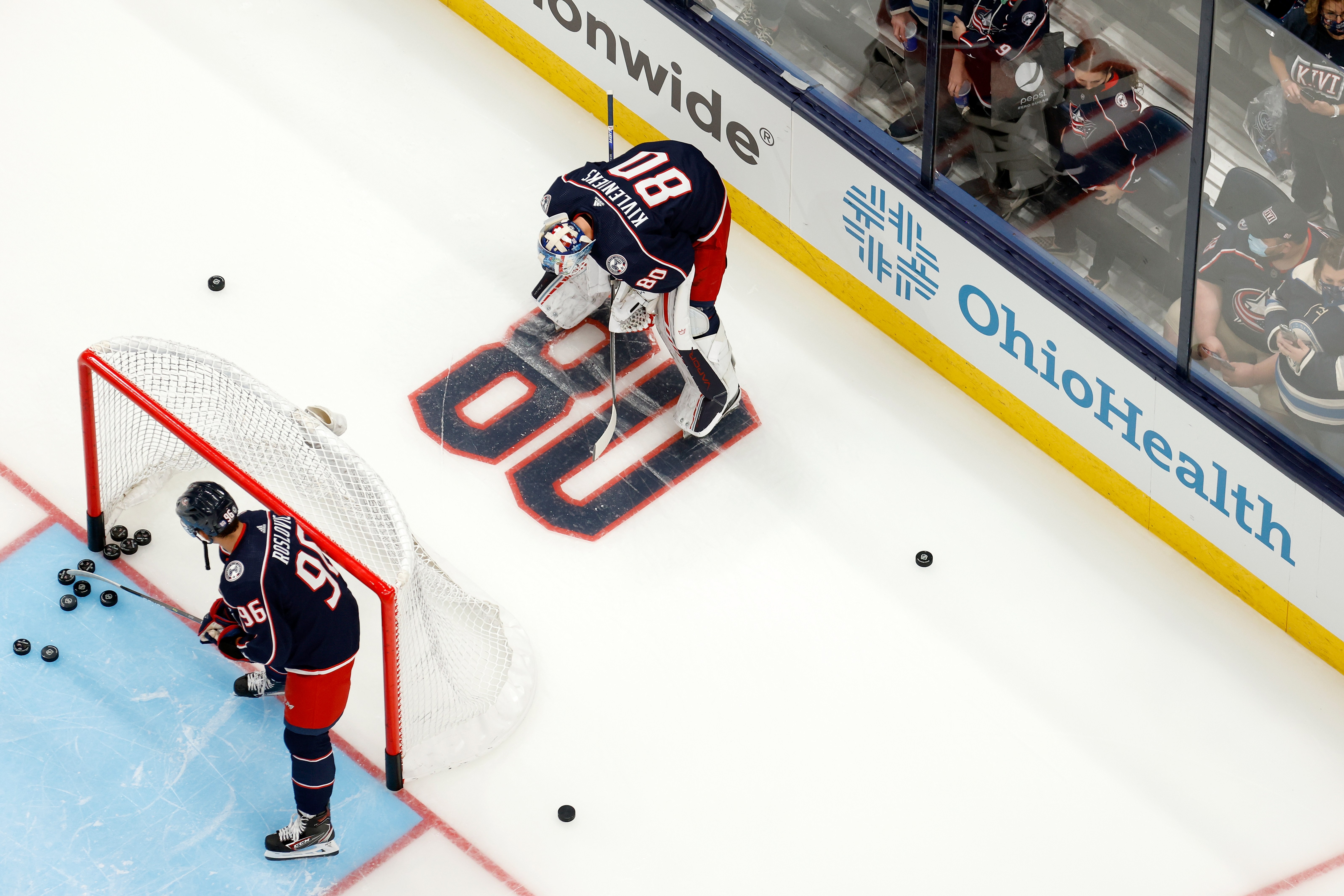 COLUMBUS, OH – OCTOBER 14: The number 80 is shown painted on the ice in memory of goalie Matiss Kivlenieks of the Columbus Blue Jackets, who was killed in a fireworks accident over the summer, as Elvis Merzlikins #90, wearing Kivlenieks’s #80, warms up for the Blue Jackets prior to a game against the Arizona Coyotes at Nationwide Arena on October 14, 2021 in Columbus, Ohio. (Photo by Kirk Irwin/Getty Images)