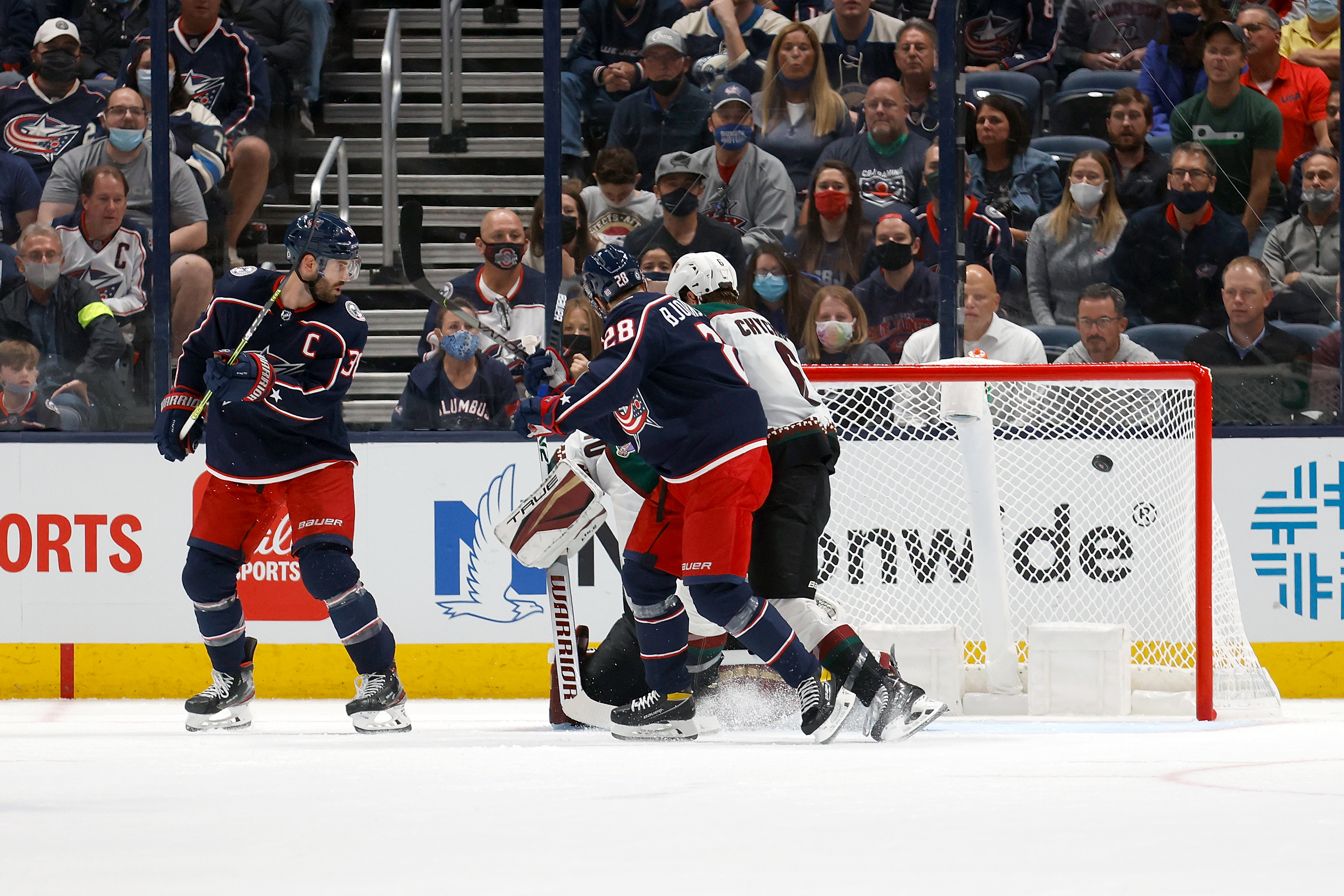 COLUMBUS, OH – OCTOBER 14: Oliver Bjorkstrand #28 of the Columbus Blue Jackets deflects the puck past goalie Carter Hutton #40 of the Arizona Coyotes for a power-play goal in the first period at Nationwide Arena on October 14, 2021 in Columbus, Ohio. (Photo by Kirk Irwin/Getty Images)