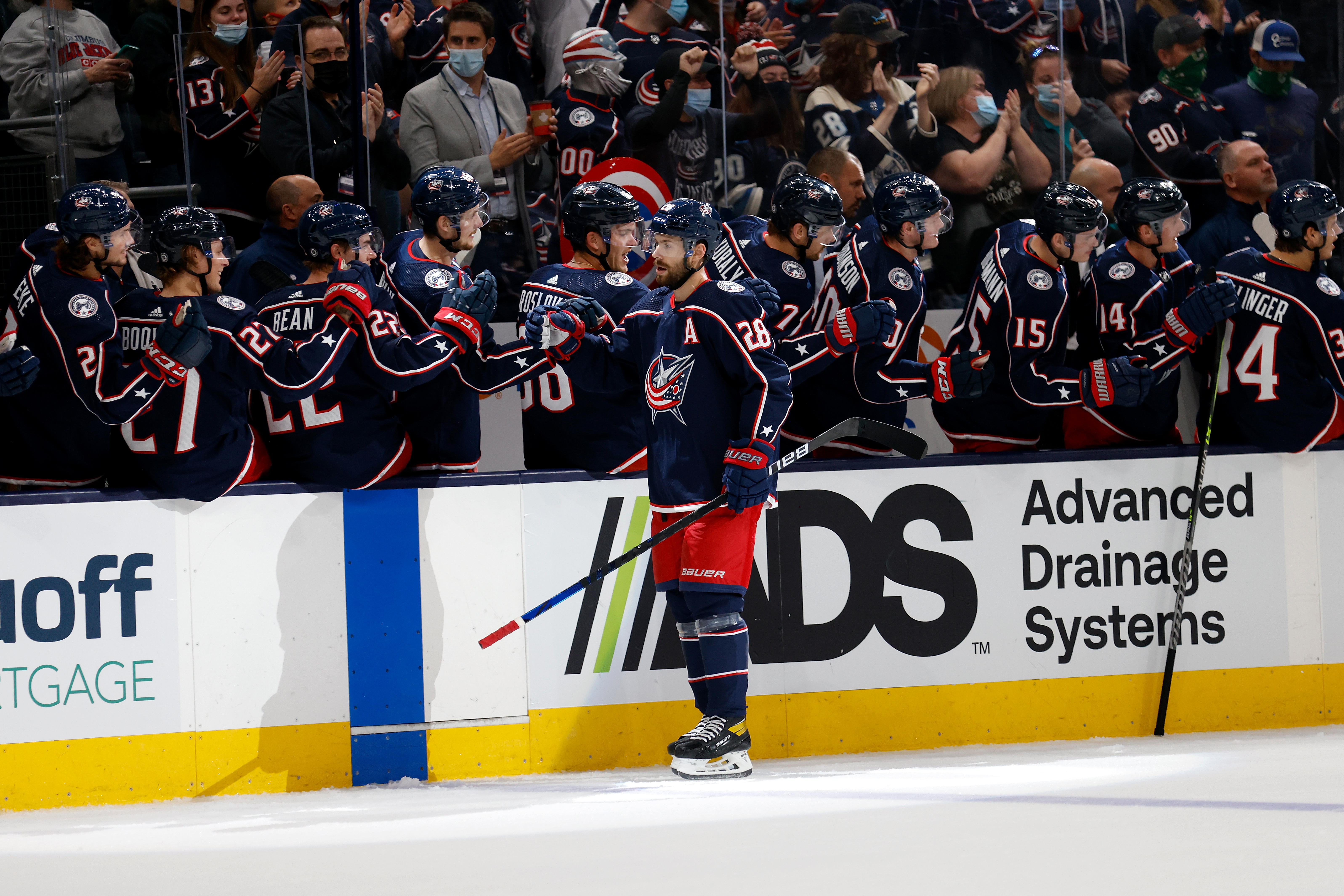 COLUMBUS, OH – OCTOBER 14: Boone Jenner #38 of the Columbus Blue Jackets reacts after teammate Oliver Bjorkstrand #28 scored a power-play goal in the first period against the Arizona Coyotes at Nationwide Arena on October 14, 2021 in Columbus, Ohio. (Photo by Kirk Irwin/Getty Images)