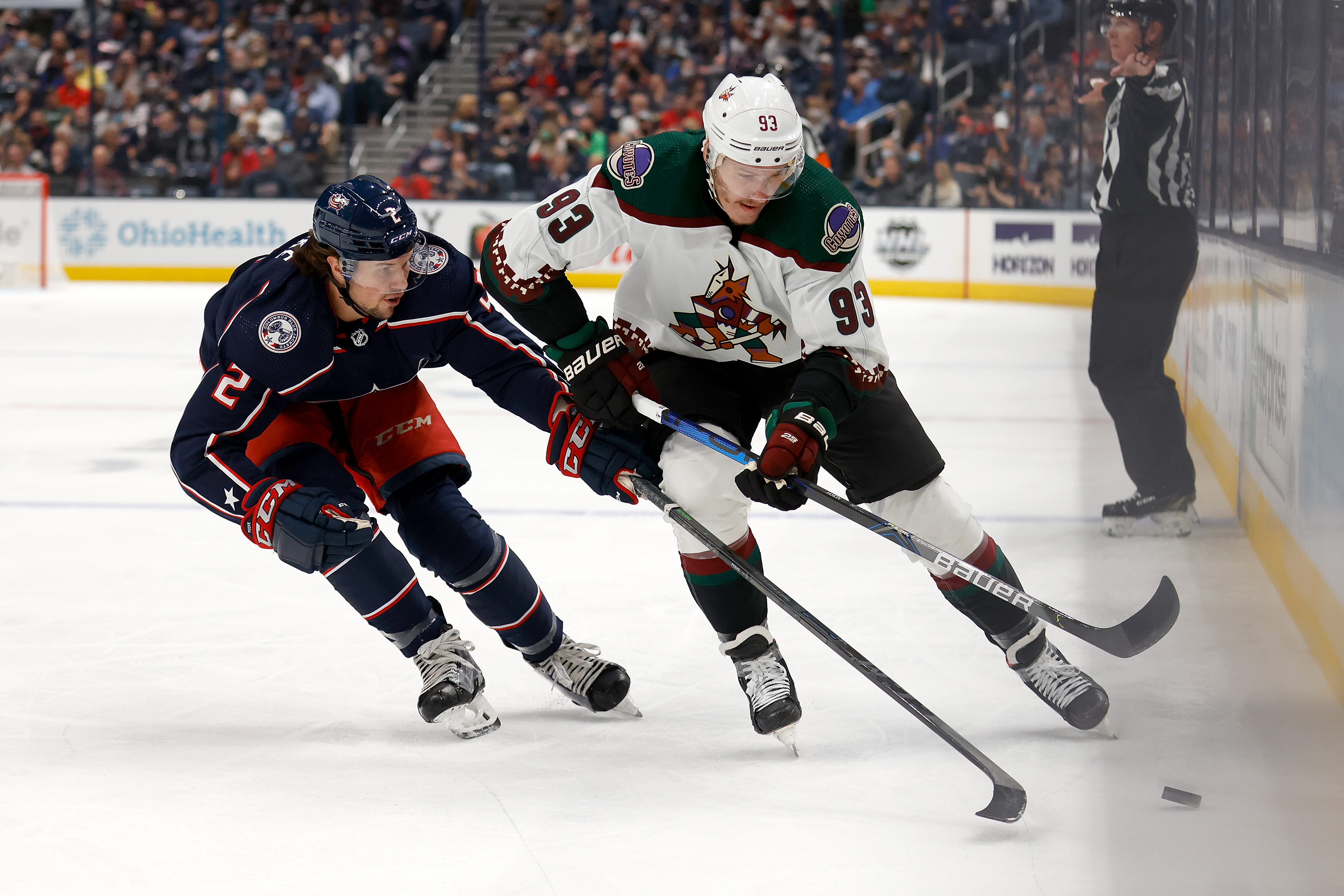 COLUMBUS, OH – OCTOBER 14: Andrew Peeke #2 of the Columbus Blue Jackets attempts to knock the puck away from Dmitrij Jaskin #93 of the Arizona Coyotes during the first period at Nationwide Arena on October 14, 2021 in Columbus, Ohio. (Photo by Kirk Irwin/Getty Images)