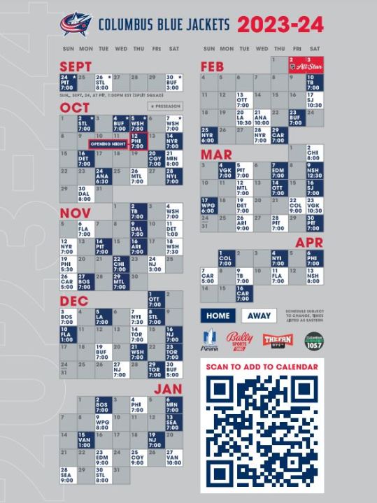 The Blue Jackets begin their season at home against former coach John Tortorella and the Philadelphia Flyers on Thursday, October 12. The first four regular season games for the Jackets will be played at Nationwide Arena with its first road match on Oct. 21 against the Minnesota Wild.