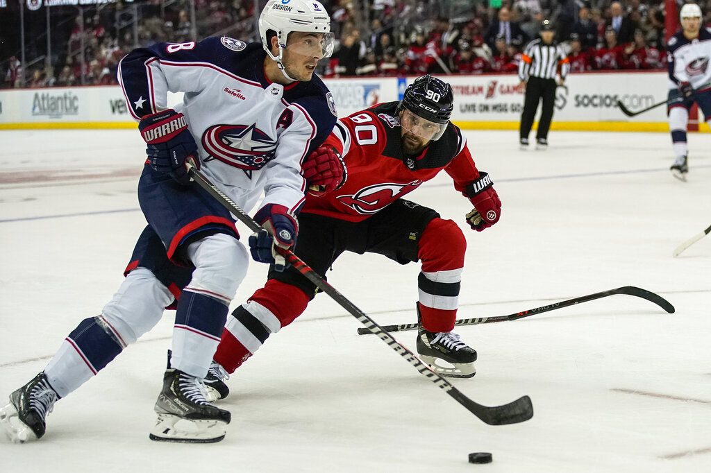 NEWARK, N.J. (AP) — Fabian Zetterland scored late in the first, Nico Hischier and defenseman Ryan Graves scored 33 seconds apart early in the second and Vitek Vanecek made 19 saves for the surging New Jersey Devils, who routed the Columbus Blue Jackets 7-1 on Sunday.