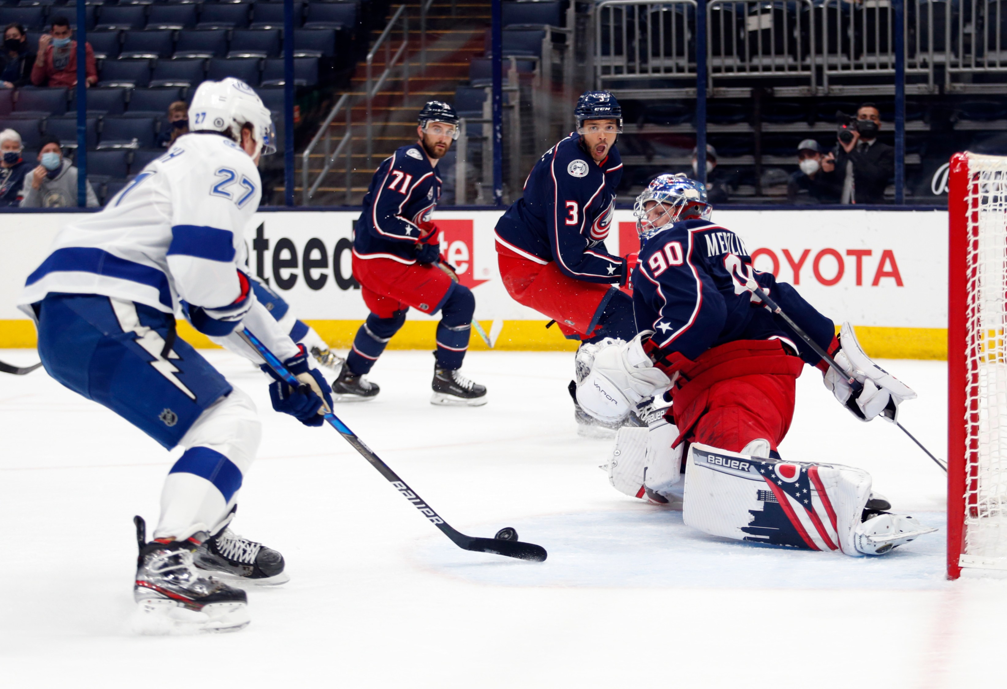 Tampa Bay Lightning defenseman Ryan McDonagh, left, shoots and scores against Columbus Blue Jackets goalie Elvis Merzlikins, right, during the first period an NHL hockey game in Columbus, Ohio, Thursday, April 8, 2021. (AP Photo/Paul Vernon)