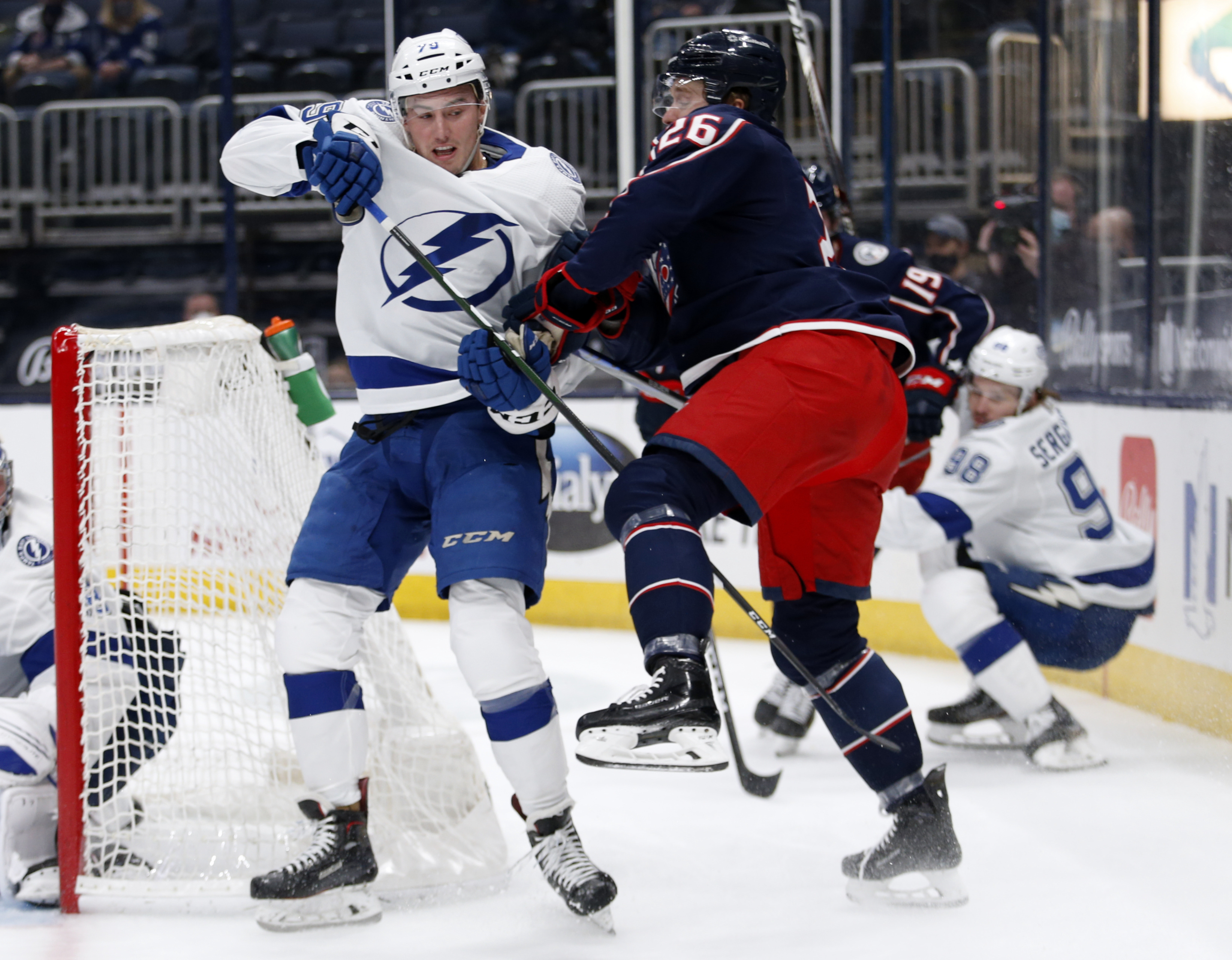 Tampa Bay Lightning forward Ross Colton, left, gets crossed up with Columbus Blue Jackets forward Zac Dalpe during the second period of an NHL hockey game in Columbus, Ohio, Thursday, April 8, 2021. (AP Photo/Paul Vernon)