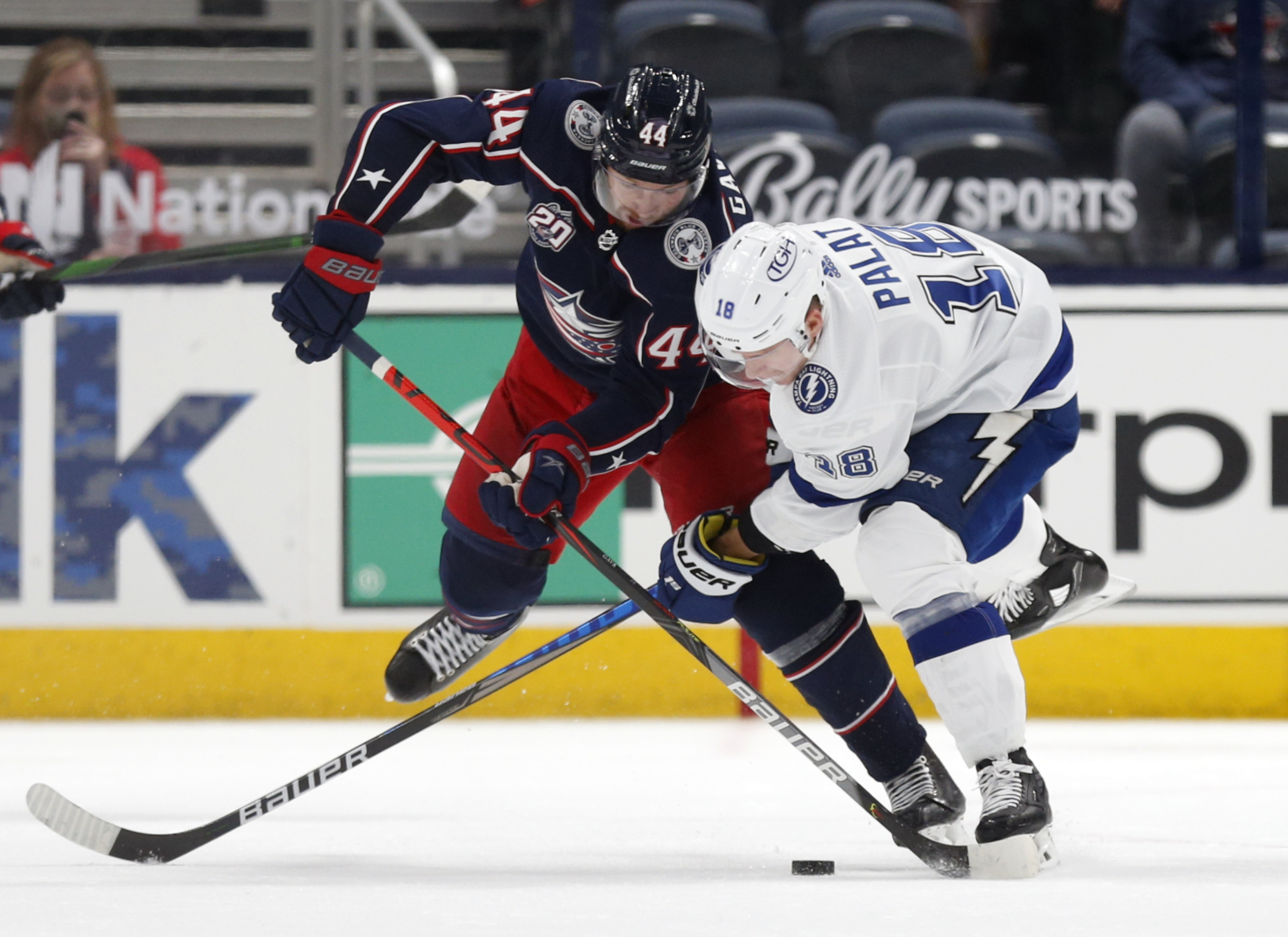 Columbus Blue Jackets defenseman Vladislav Gavrikov, left, and Tampa Bay Lightning forward Ondrej Palat work for the puck during the second period of an NHL hockey game in Columbus, Ohio, Thursday, April 8, 2021. (AP Photo/Paul Vernon)
