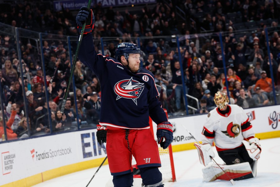 Ottawa’s Drake Batherson skated toward the middle in front of Merzlikins and fired a shot the goalie snared with a Columbus player in front of him to keep the Senators off the scoreboard 5:00 into the second period.
