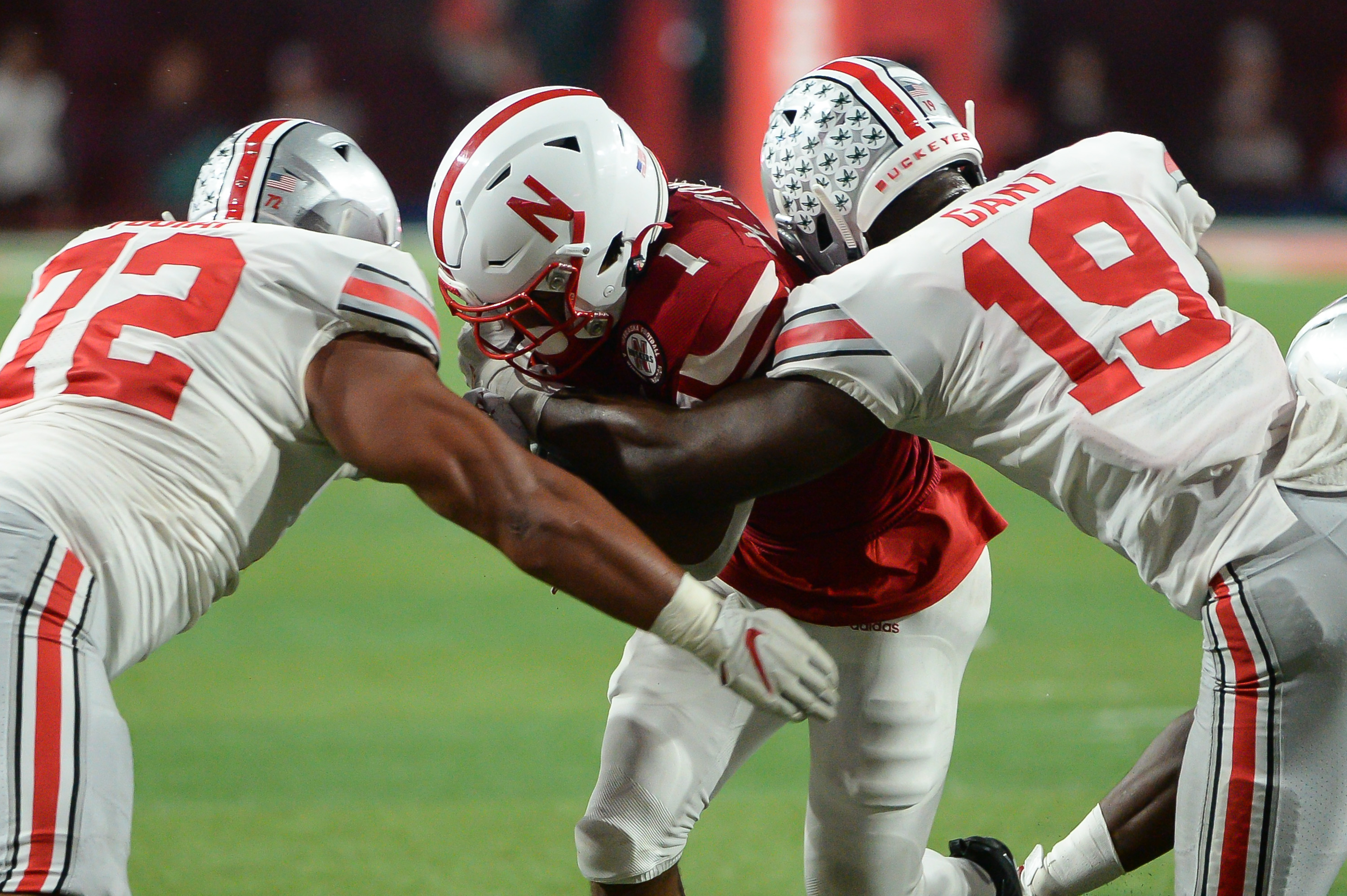 LINCOLN, NE – SEPTEMBER 28: Defensive tackle Tommy Togiai #72 of the Ohio State Buckeyes and linebacker Dallas Gant #19 combine to tackle wide receiver Wan’Dale Robinson #1 of the Nebraska Cornhuskers at Memorial Stadium on September 28, 2019 in Lincoln, Nebraska. (Photo by Steven Branscombe/Getty Images)