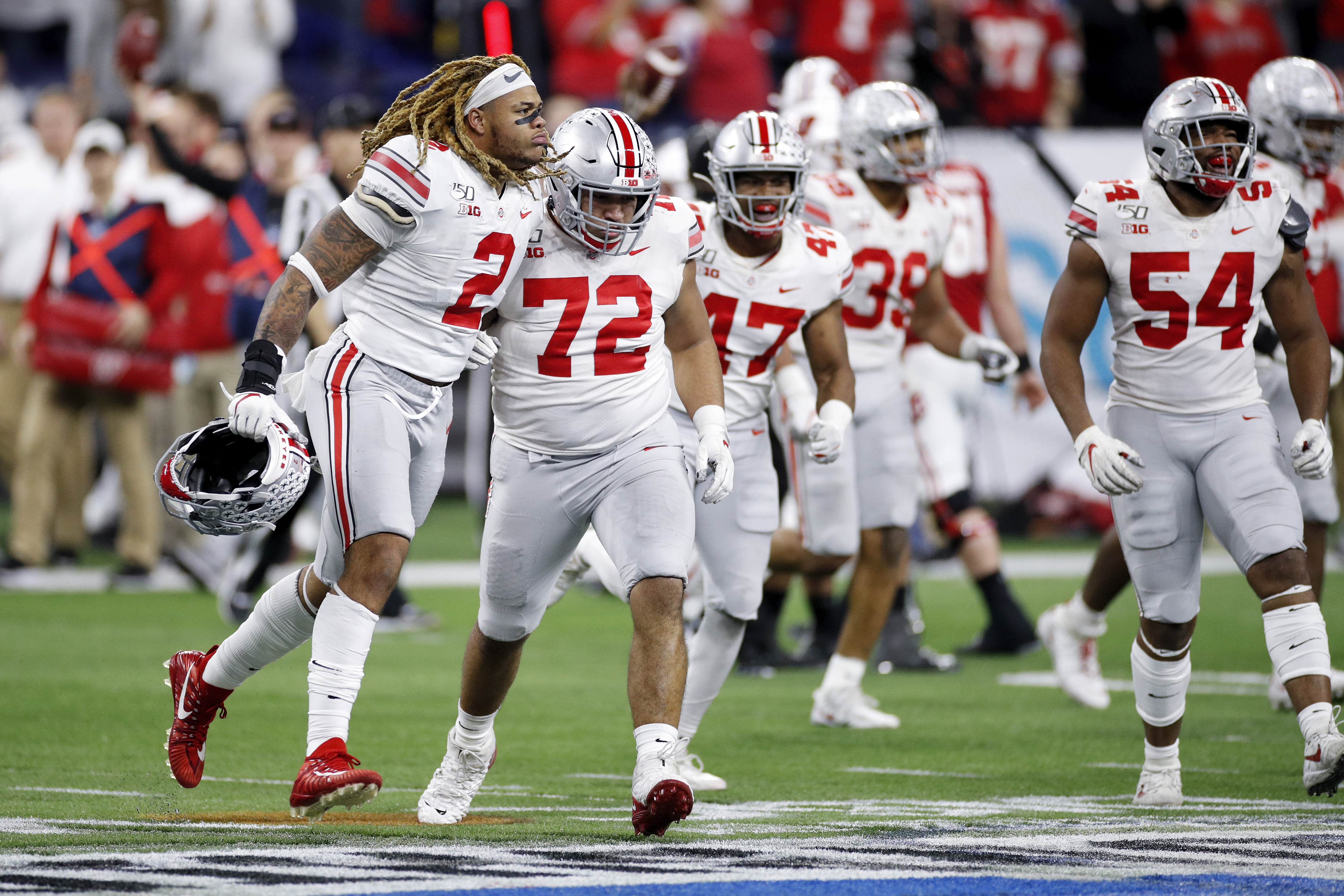 INDIANAPOLIS, IN – DECEMBER 07: Chase Young #2 and Tommy Togiai #72 of the Ohio State Buckeyes celebrate in the fourth quarter against the Wisconsin Badgers during the Big Ten Football Championship at Lucas Oil Stadium on December 7, 2019 in Indianapolis, Indiana. Ohio State defeated Wisconsin 34-21. (Photo by Joe Robbins/Getty Images)