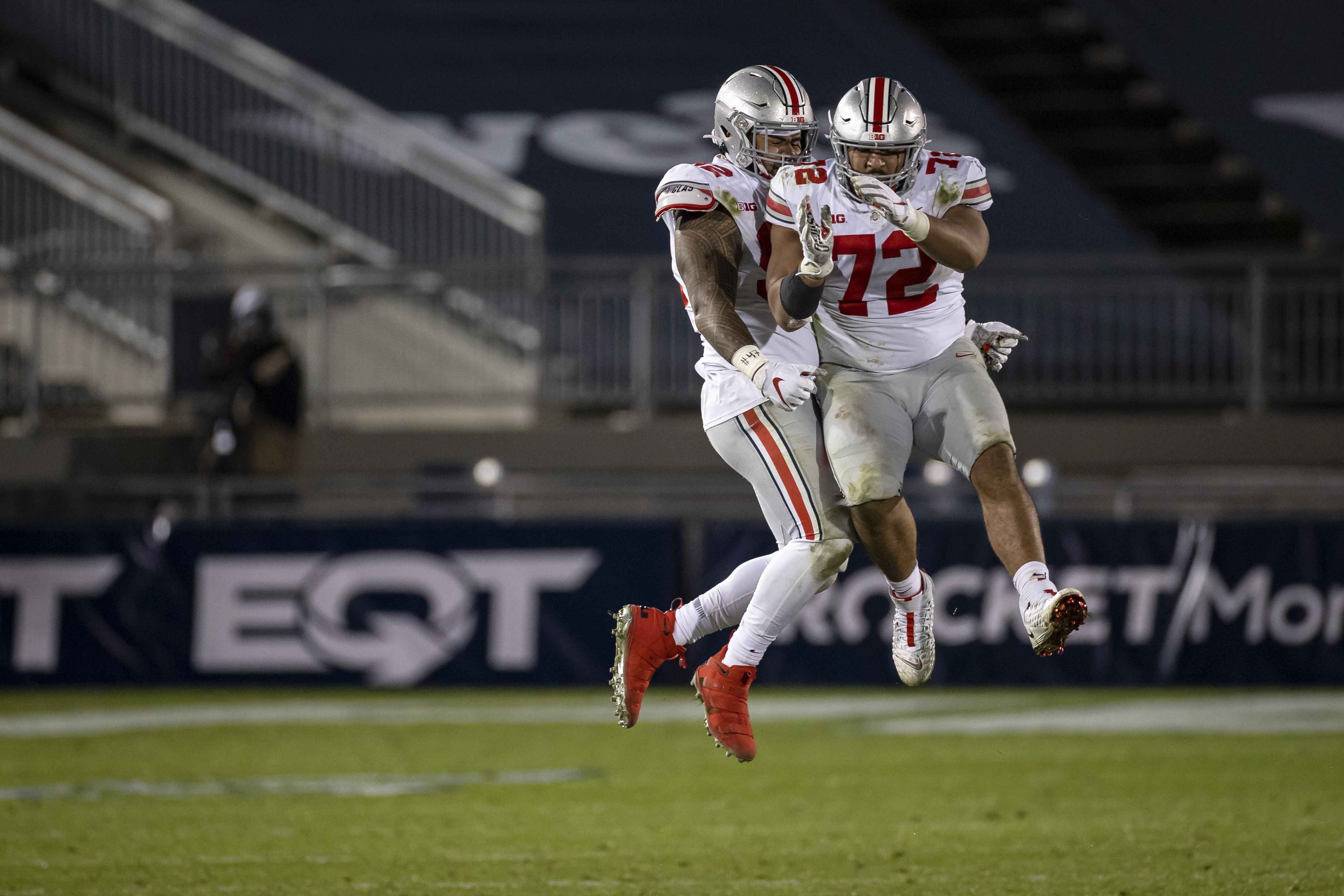 STATE COLLEGE, PA – OCTOBER 31: Haskell Garrett #92 of the Ohio State Buckeyes celebrates with Haskell Garrett #92 after a play against the Penn State Nittany Lions during the second half at Beaver Stadium on October 31, 2020 in State College, Pennsylvania. (Photo by Scott Taetsch/Getty Images)