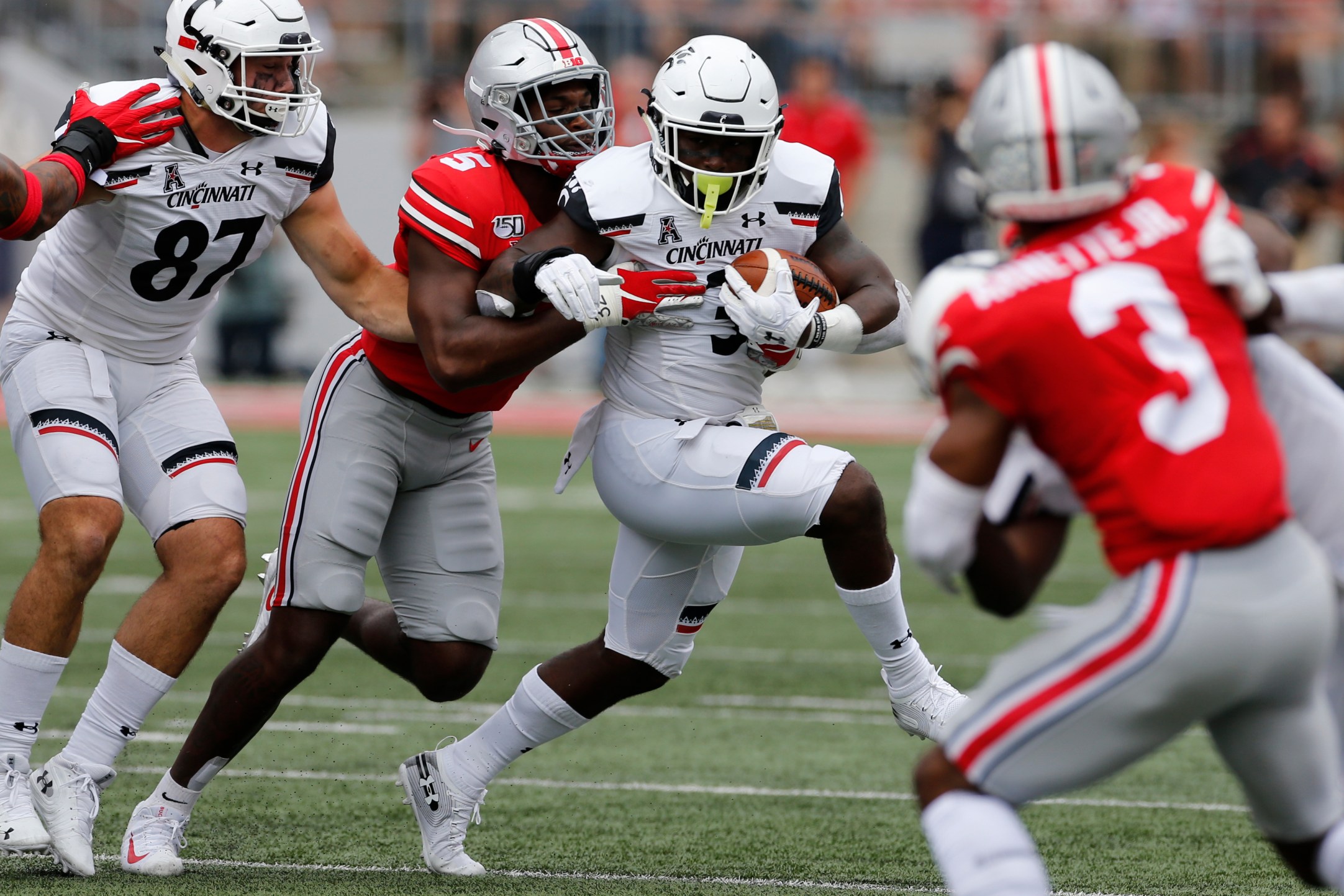 Cincinnati running back Michael Warren, center, tries to cut upfield past Ohio State linebacker Baron Browning during the first half of an NCAA college football game Saturday, Sept. 7, 2019, in Columbus, Ohio. (AP Photo/Jay LaPrete)