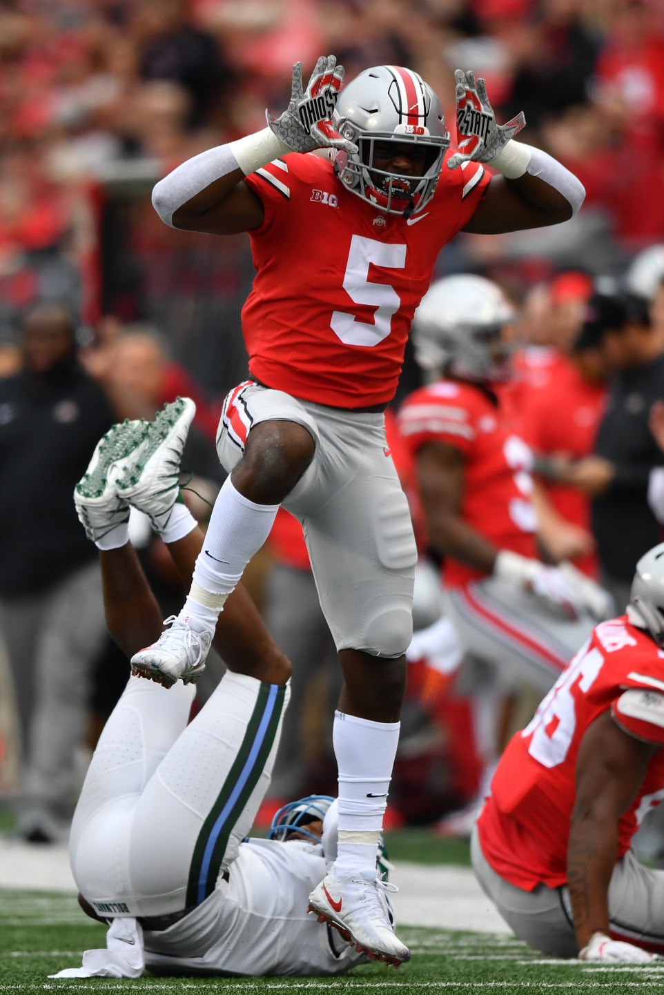 COLUMBUS, OH – SEPTEMBER 22: Baron Browning #5 of the Ohio State Buckeyes celebrates after tackling Terren Encalade #5 of the Tulane Green Wave for a six-yard loss in the first quarter at Ohio Stadium on September 22, 2018 in Columbus, Ohio. (Photo by Jamie Sabau/Getty Images)