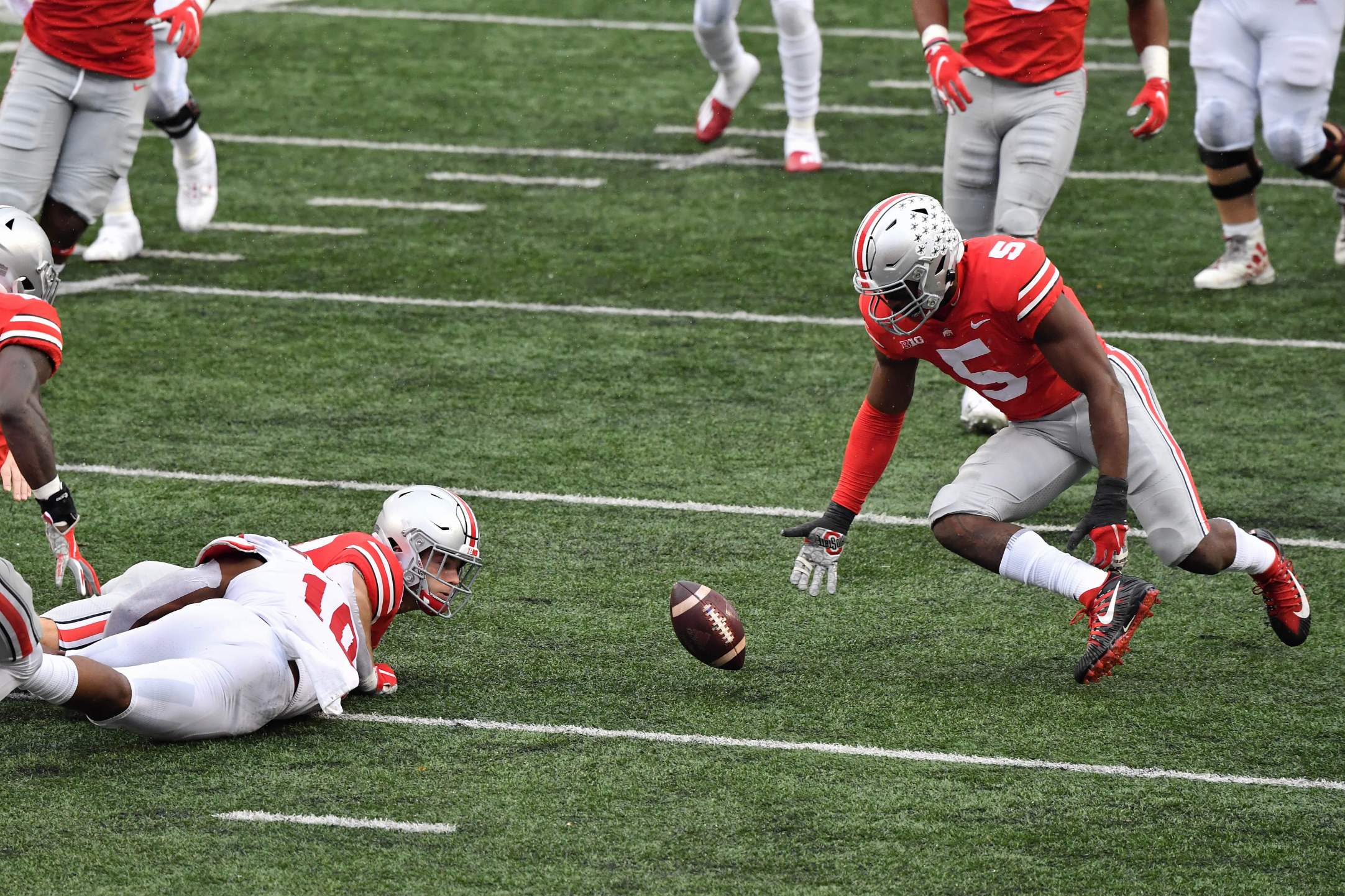 COLUMBUS, OH – NOVEMBER 21: Baron Browning #5 of the Ohio State Buckeyes recovers an Indiana Hoosiers fumble on the seven-yard line in the second quarter at Ohio Stadium on November 21, 2020 in Columbus, Ohio. (Photo by Jamie Sabau/Getty Images)