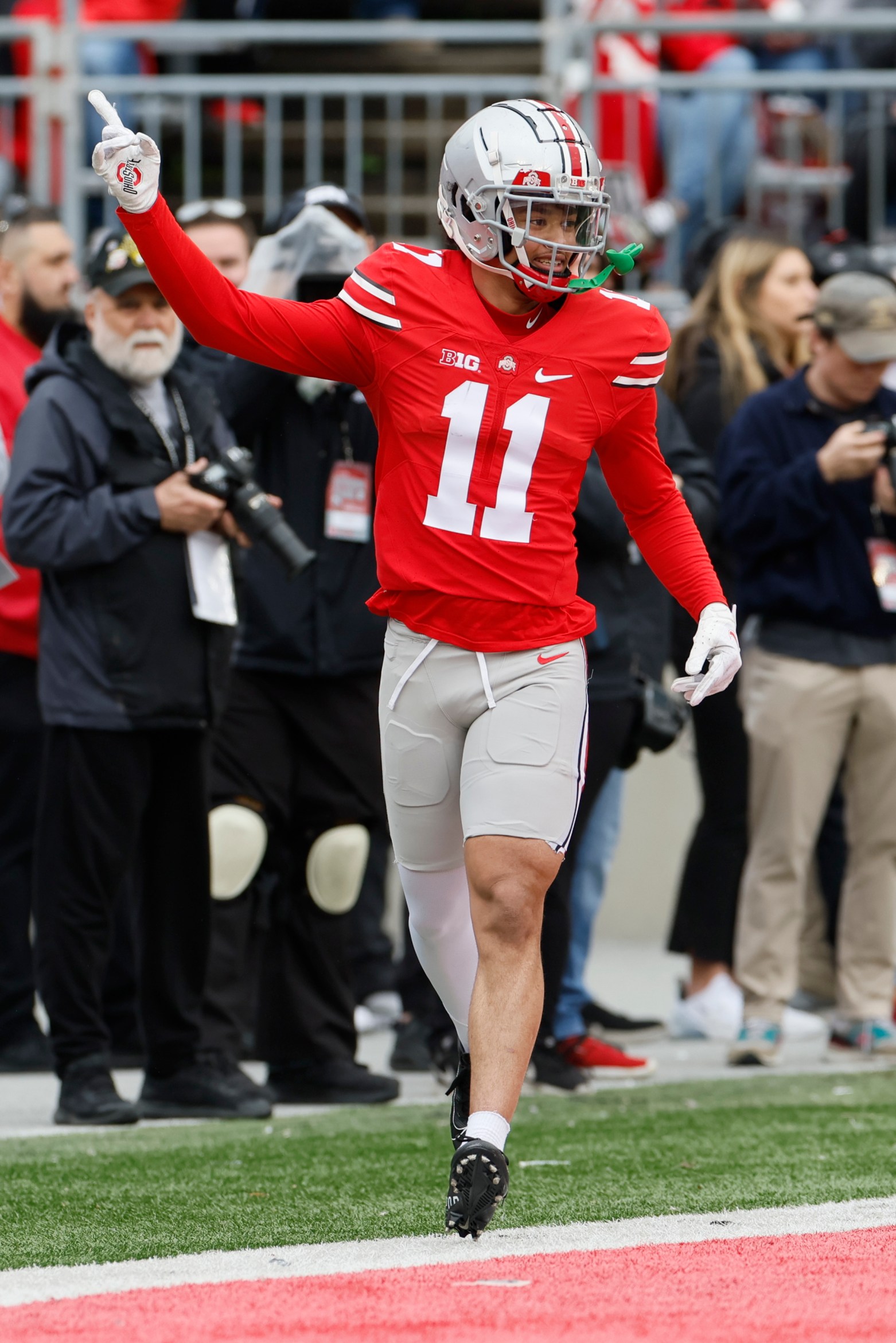 Denzel Burke, who had the most zone coverage snaps last season in the Big Ten without allowing a touchdown, made arguably the hardest play of the day by breaking up a pass one-on-one on a fade route in the end zone against a much bigger Marvin Harrison Jr.
