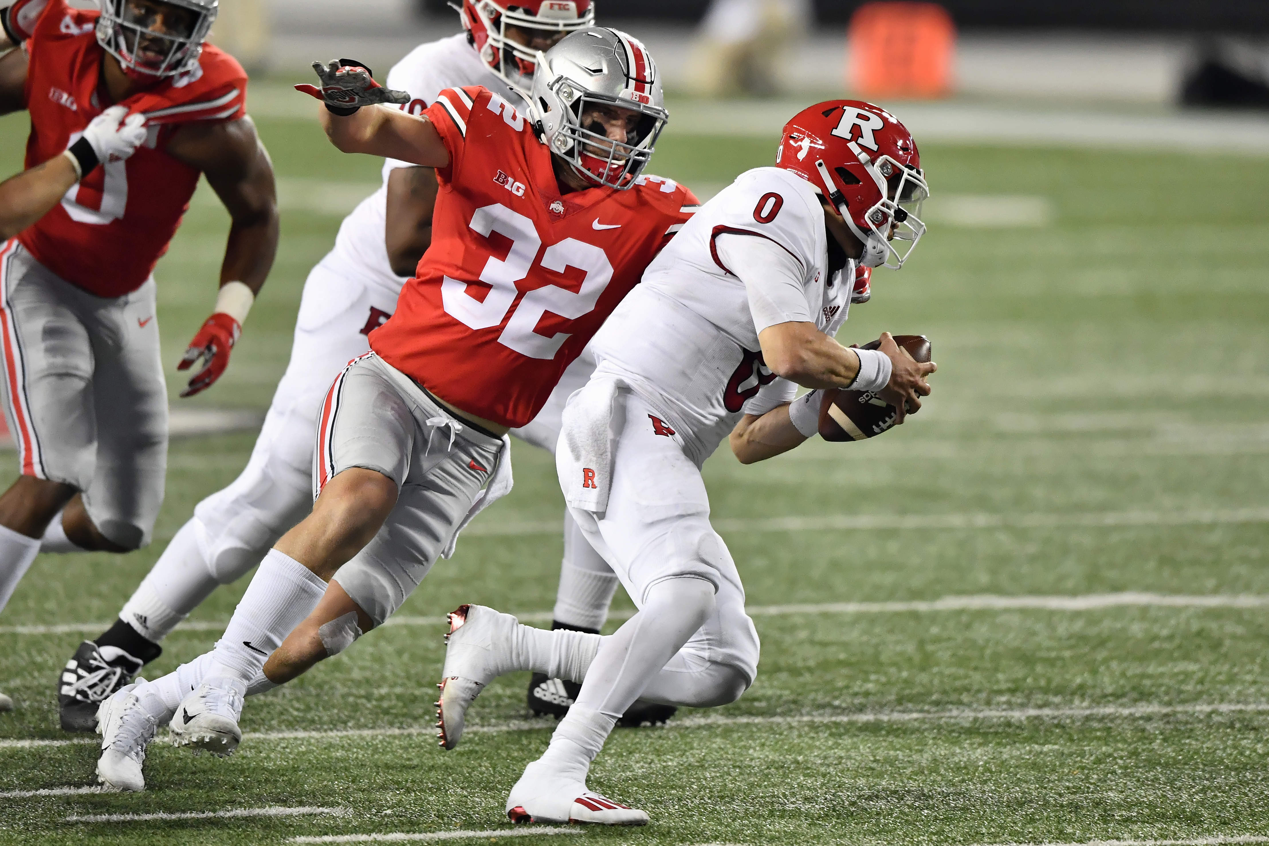 COLUMBUS, OH – NOVEMBER 7: Tuf Borland #32 of the Ohio State Buckeyes chases down quarterback Noah Vedral #0 of the Rutgers Scarlet Knights for a sack in the second quarter at Ohio Stadium on November 7, 2020 in Columbus, Ohio. (Photo by Jamie Sabau/Getty Images)