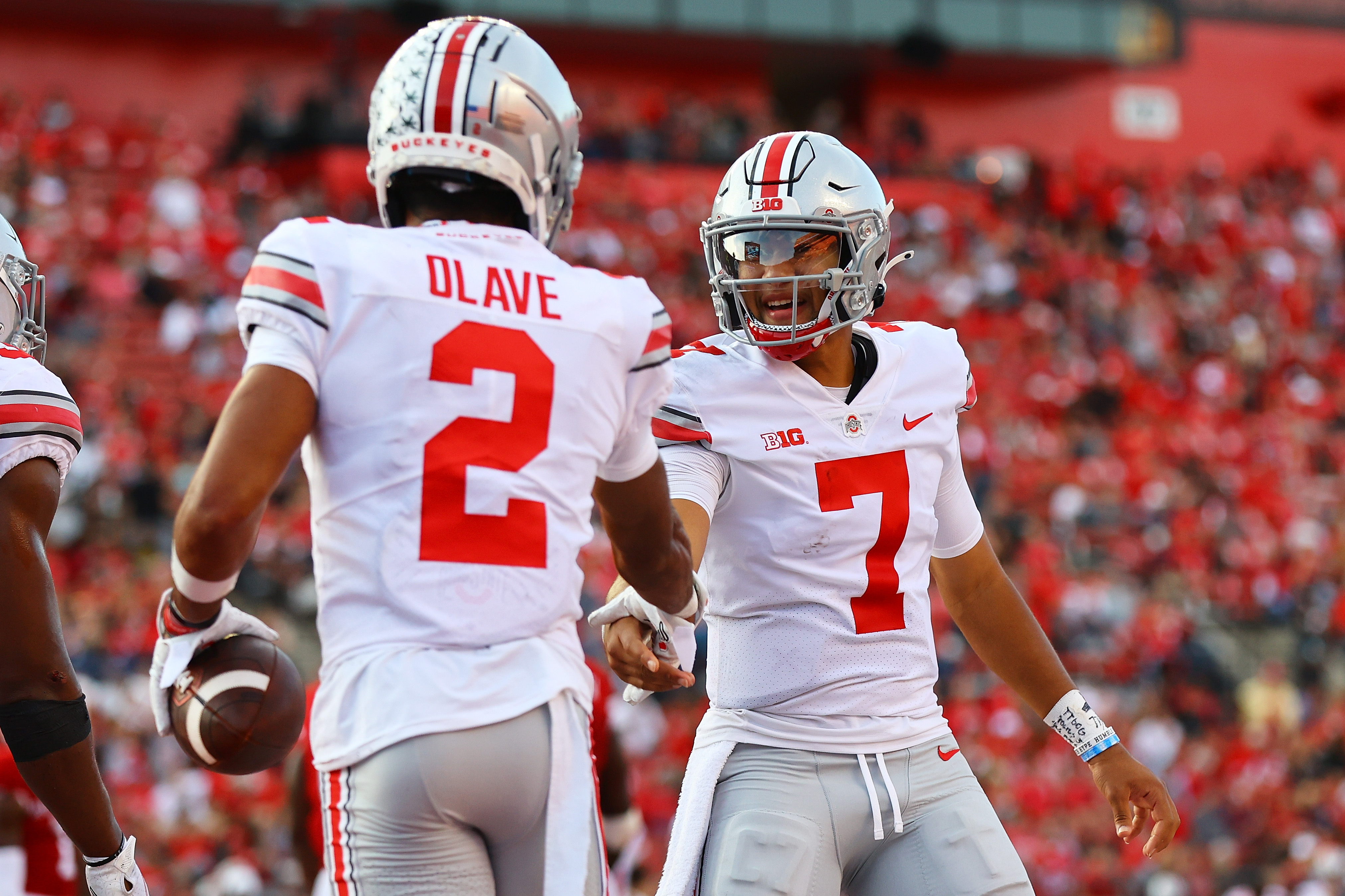 PISCATAWAY, NEW JERSEY – OCTOBER 02: Chris Olave #2 of the Ohio State Buckeyes celebrates scoring a touchdown with C.J. Stroud #7 against the Rutgers Scarlet Knights at SHI Stadium on October 02, 2021 in Piscataway, New Jersey. (Photo by Mike Stobe/Getty Images)