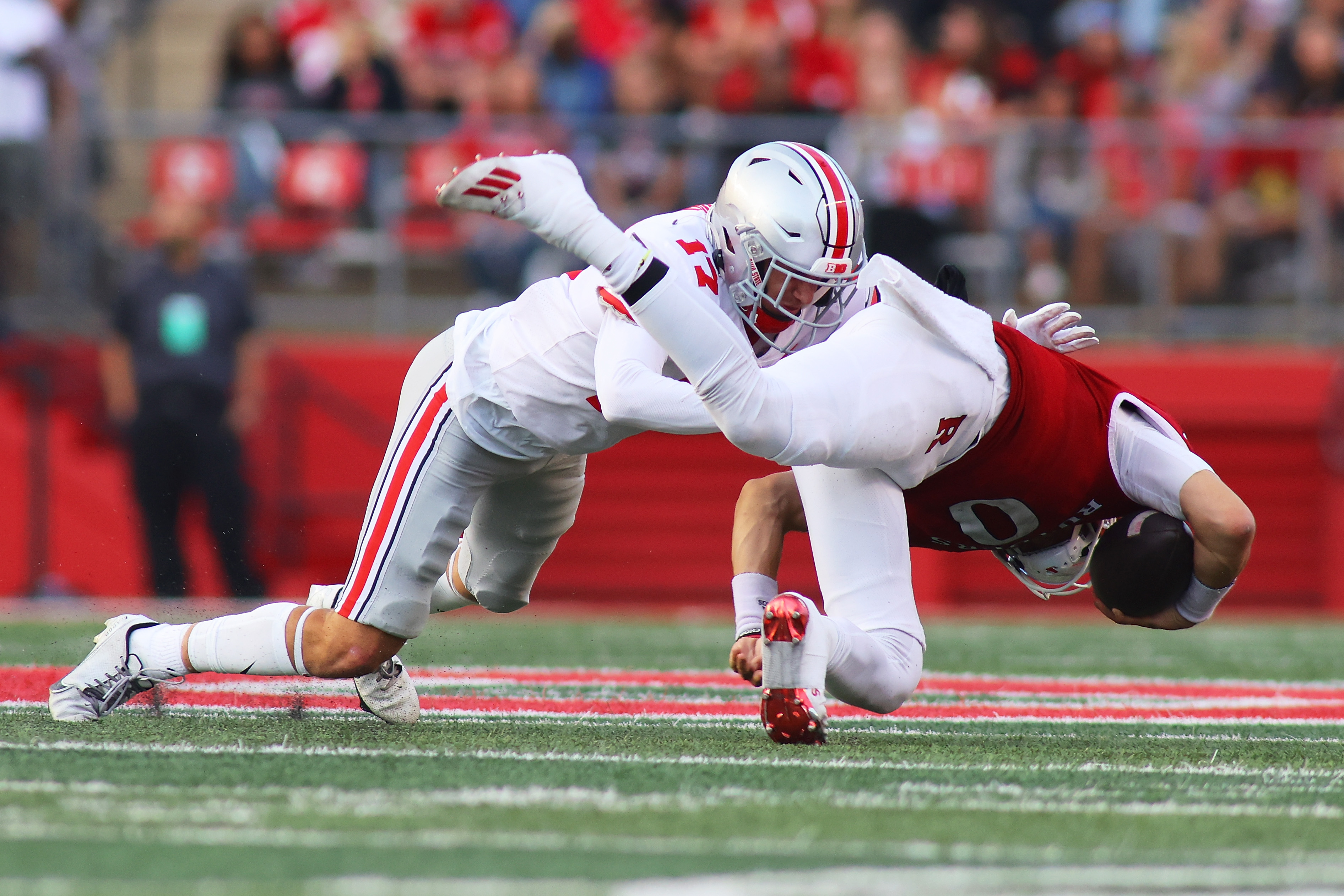 PISCATAWAY, NEW JERSEY – OCTOBER 02: Bryson Shaw #17 of the Ohio State Buckeyes tackles Noah Vedral #0 of the Rutgers Scarlet Knights at SHI Stadium on October 02, 2021 in Piscataway, New Jersey. (Photo by Mike Stobe/Getty Images)