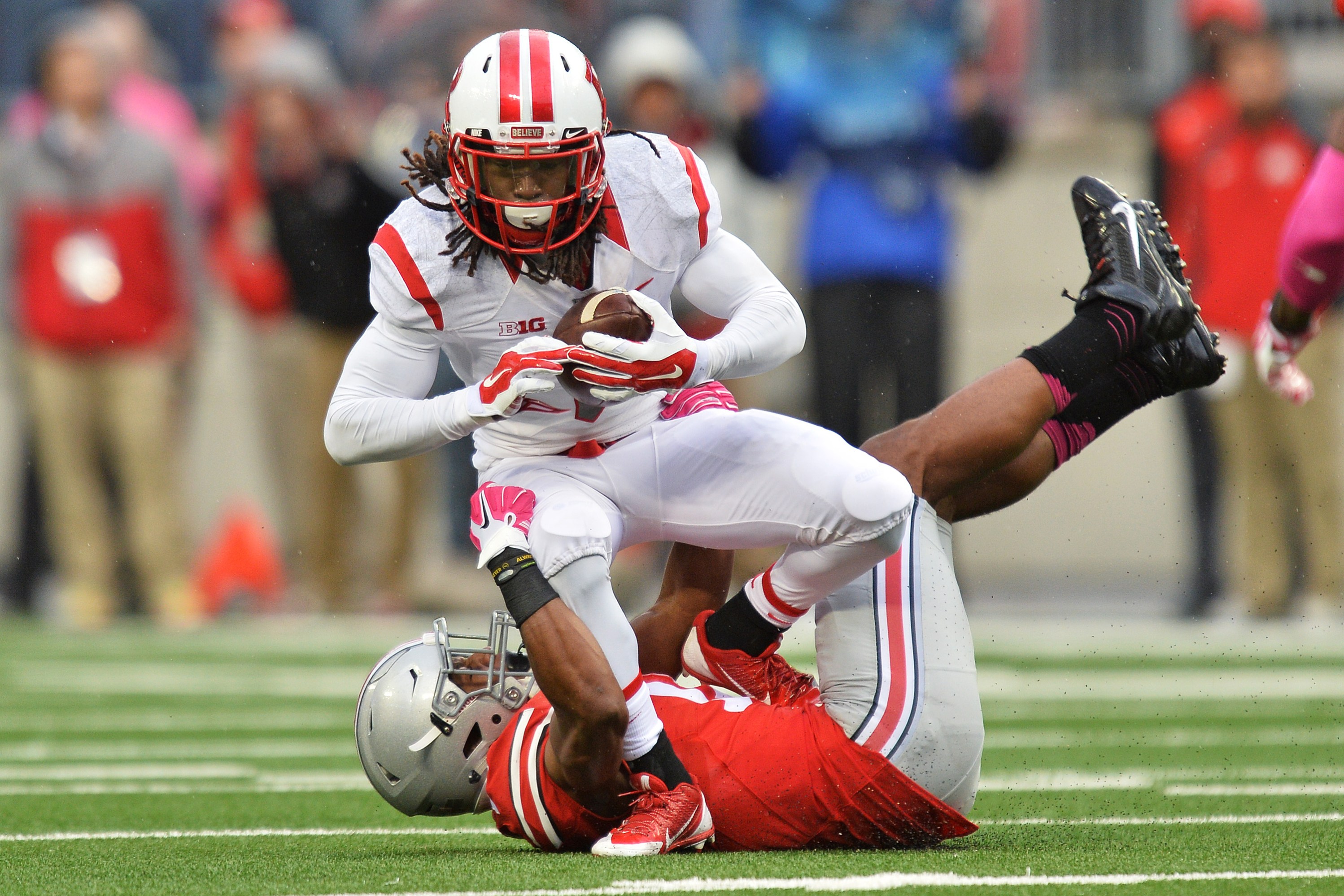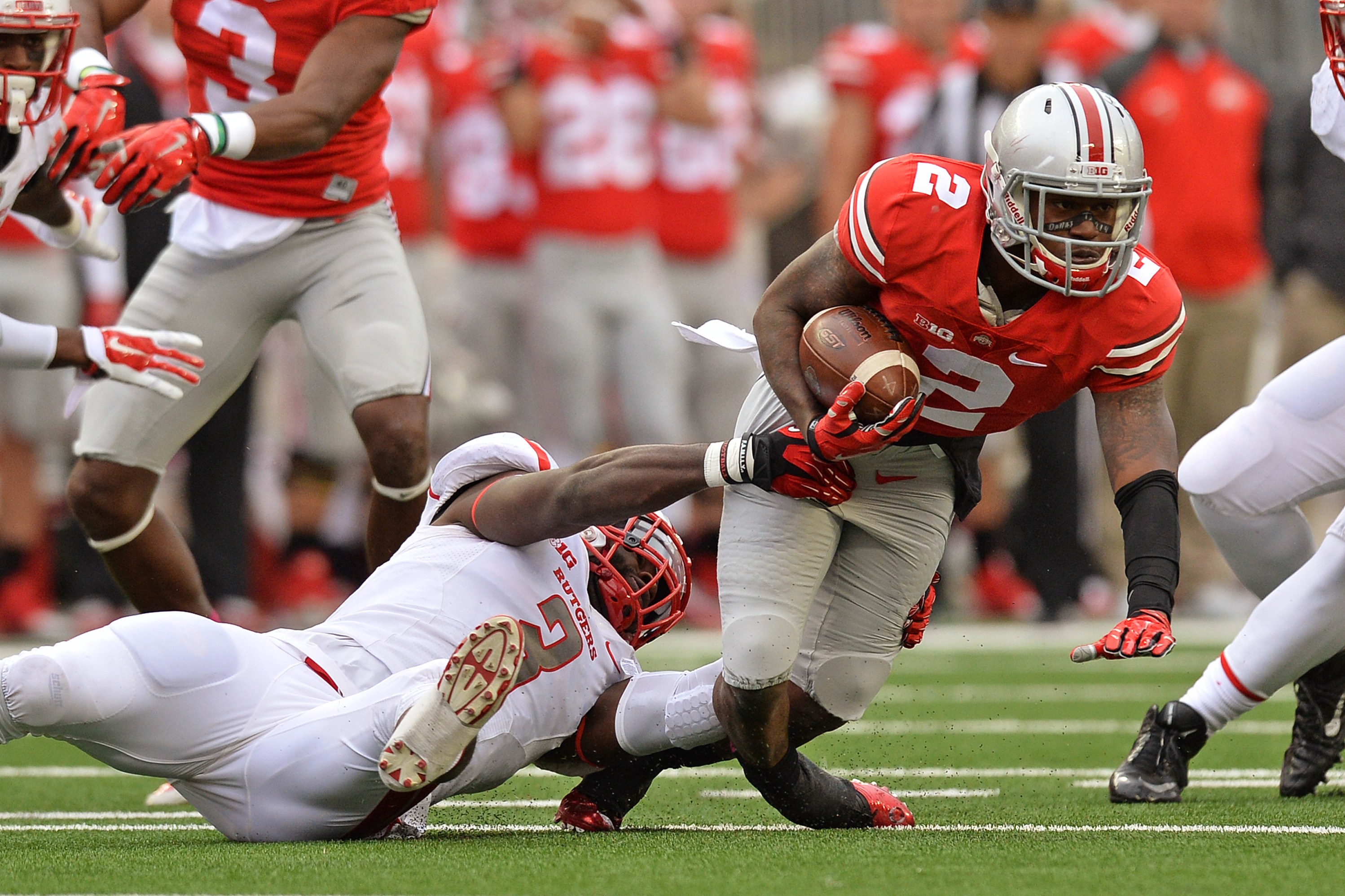 COLUMBUS, OH – OCTOBER Janarion Grant #1 of the Rutgers Scarlet Knights is brought down by Vonn Bell #11 of the Ohio State Buckeyes after a pass reception in the second quarter 18: on October 18, 2014 at Ohio Stadium in Columbus, Ohio.. (Photo by Jamie Sabau/Getty Images)