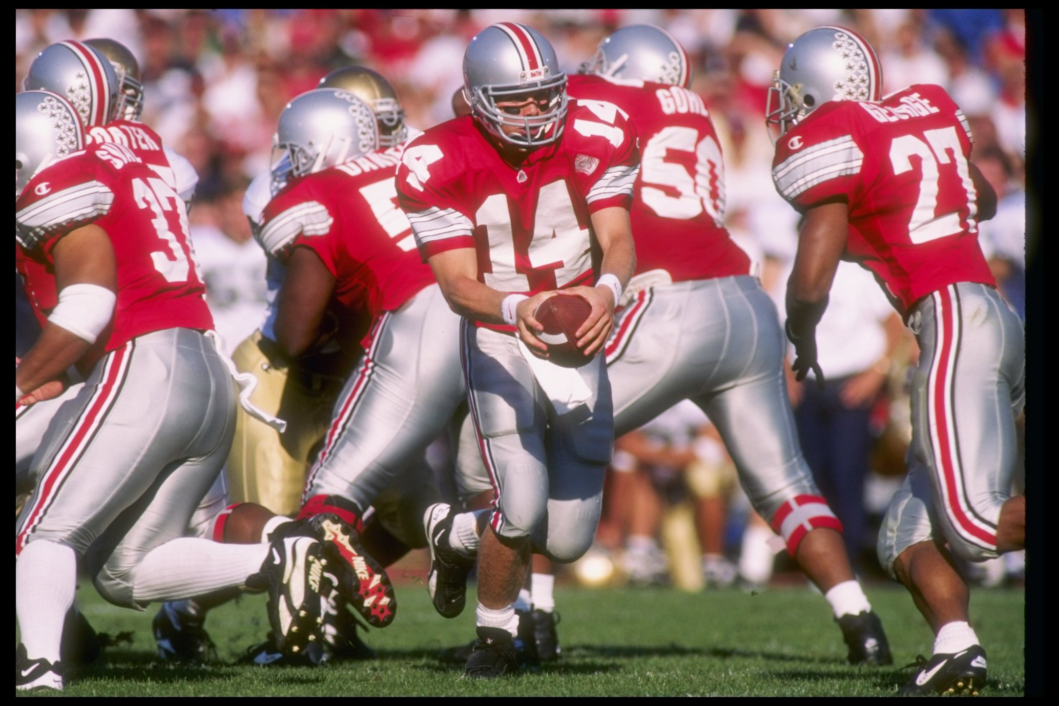 30 Sep 1995: Quarterback Bobby Hoying of the Ohio State Buckeyes hands off the ball during a game against the Notre Dame Fighting Irish at Ohio Stadium in Columbus, Ohio. Ohio State won the game 45-26. Mandatory Credit: Andy Lyons /Allsport