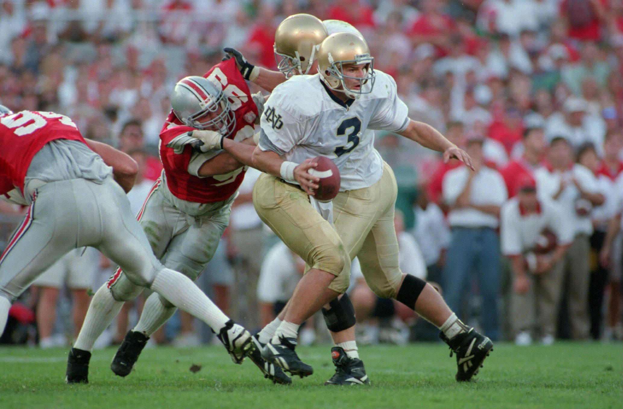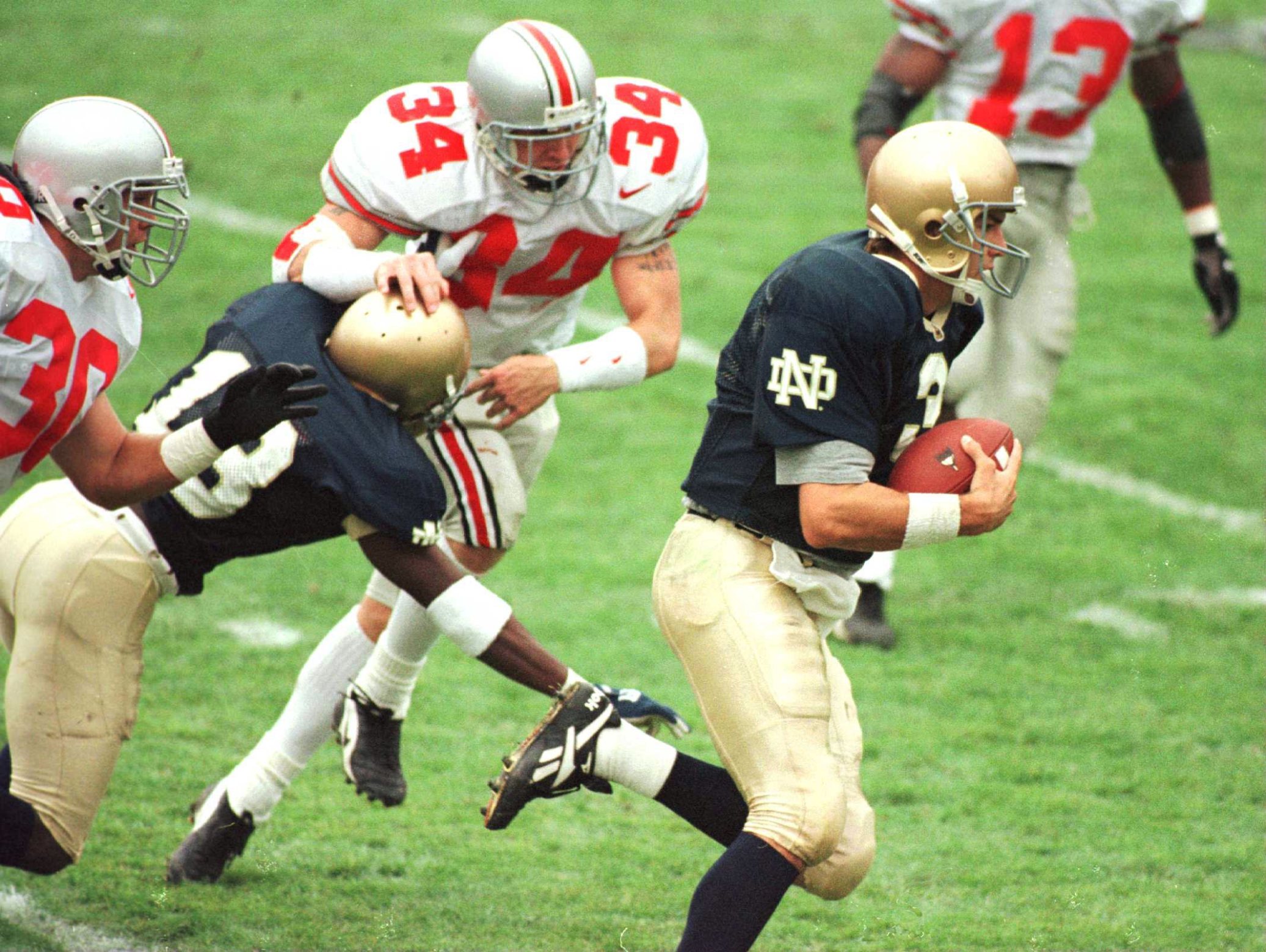27 Sep 1996: Quarterback Ron Pwolus #3 of the Notre Dame Fighting Irish looks up field as he scrambles with the football attempting to elude pursuing defenders from the Ohio State Buckeyes during a play in the Irish’s 29-16 loss to the Buckeyes at Notre D