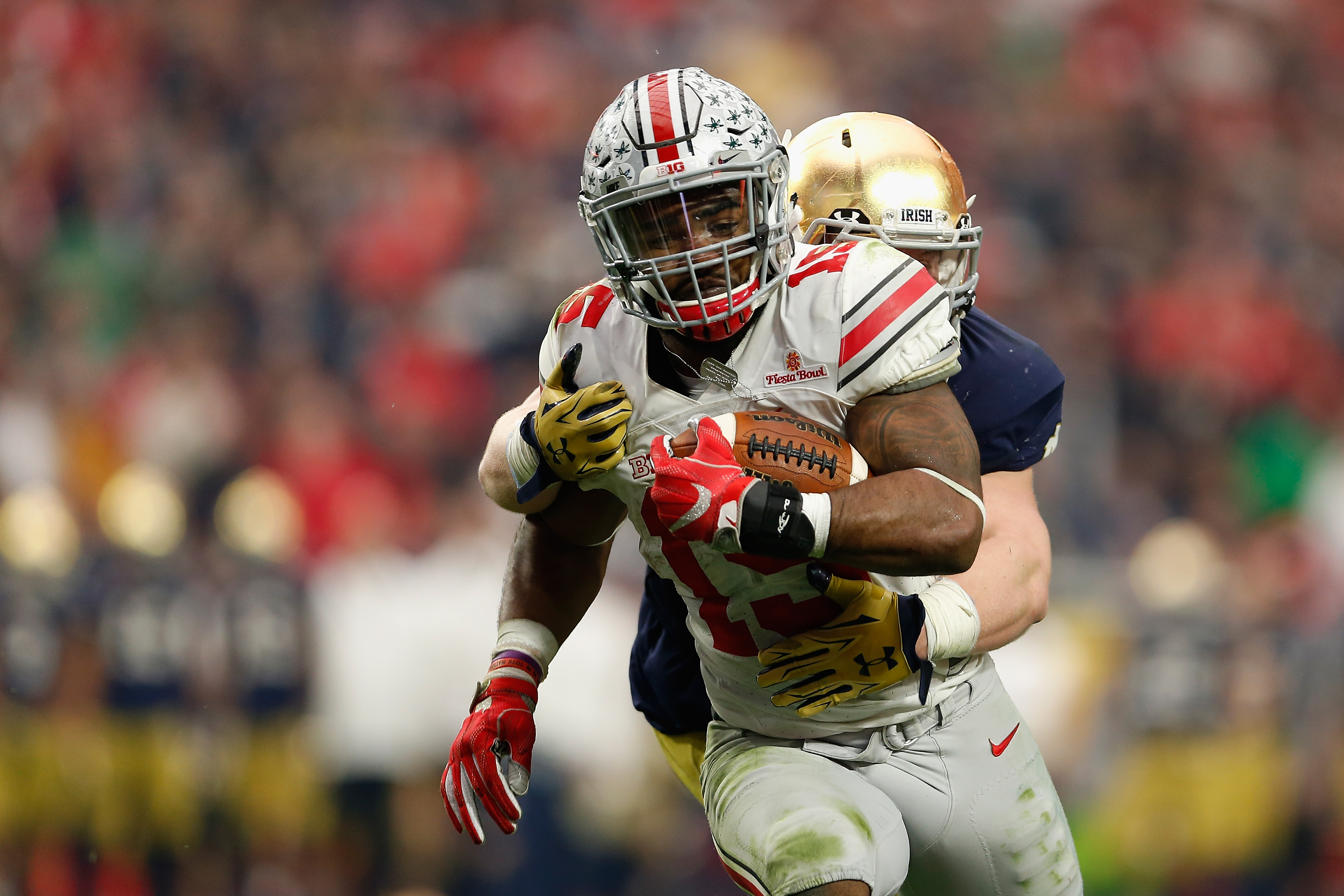 GLENDALE, AZ – JANUARY 01: Running back Ezekiel Elliott #15 of the Ohio State Buckeyes rushes the football during the second half of the BattleFrog Fiesta Bowl at University of Phoenix Stadium on January 1, 2016 in Glendale, Arizona. The Ohio State Buckeyes beat the Notre Dame Fighting Irish 44-28. (Photo by Christian Petersen/Getty Images)