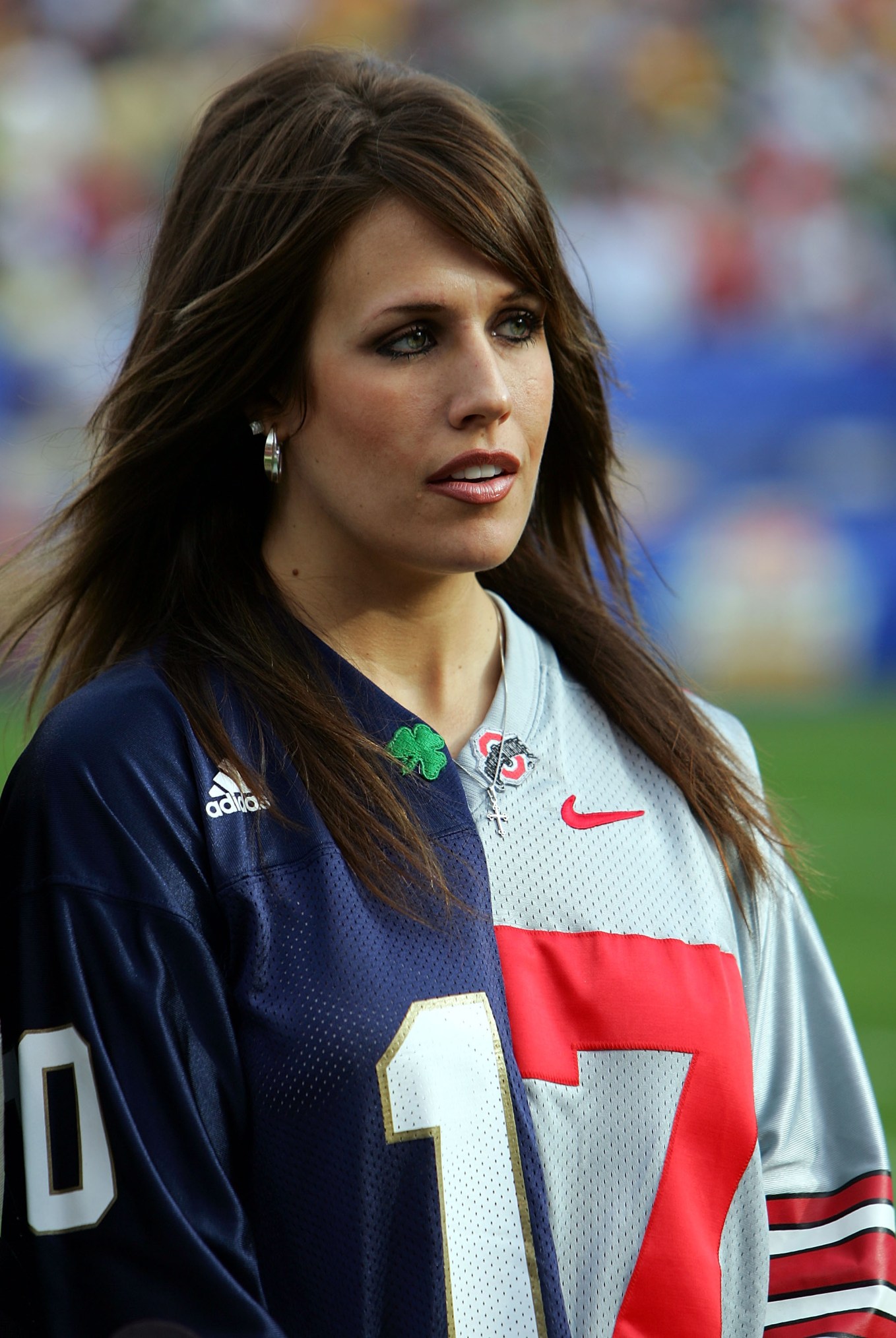 TEMPE, AZ – JANUARY 2: Lauren Quinn, the sister of Notre Dame Fight Irish quarterback Brady Quinn and the girlfriend of Ohio State Buckeyes linebacker A.J. Hawk wears a jersey representing both teams before the Tostito’s Fiesta Bowl at the Sun Devil Stadium on January 2, 2006 in Tempe, Arizona. (Photo by Jeff Gross/Getty Images)