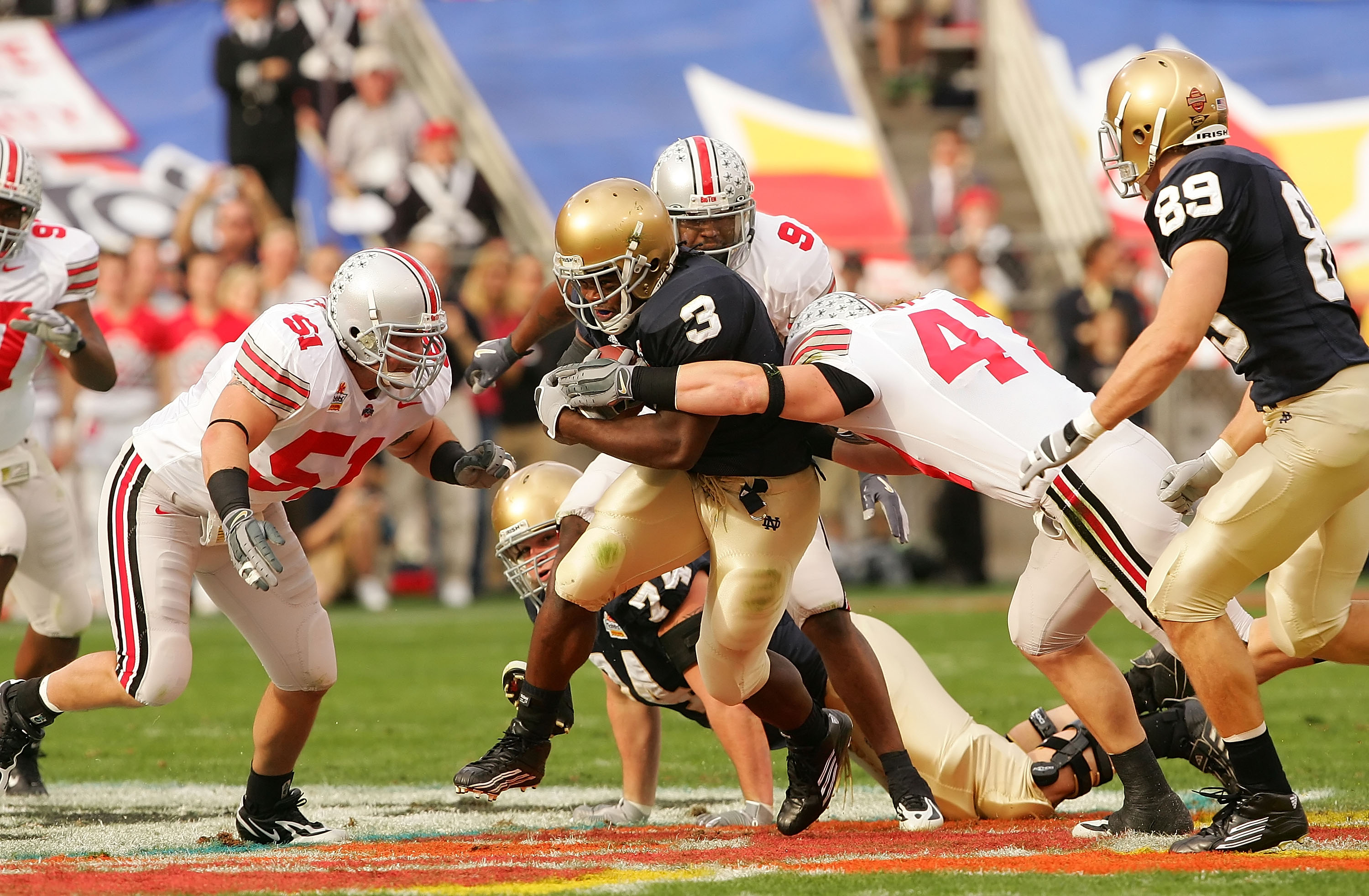 TEMPE, AZ – JANUARY 02: Running back Darius Walker #3 of the Notre Dame Fighting Irish runs as linebakcer A.J. Hawk #47 of the Ohio State Buckeyes grabs him in the first quarter of the Tostito’s Fiesta Bowl at Sun Devil Stadium on January 2, 2006 in Tempe, Arizona. (Photo by Lisa Blumenfeld/Getty Images)