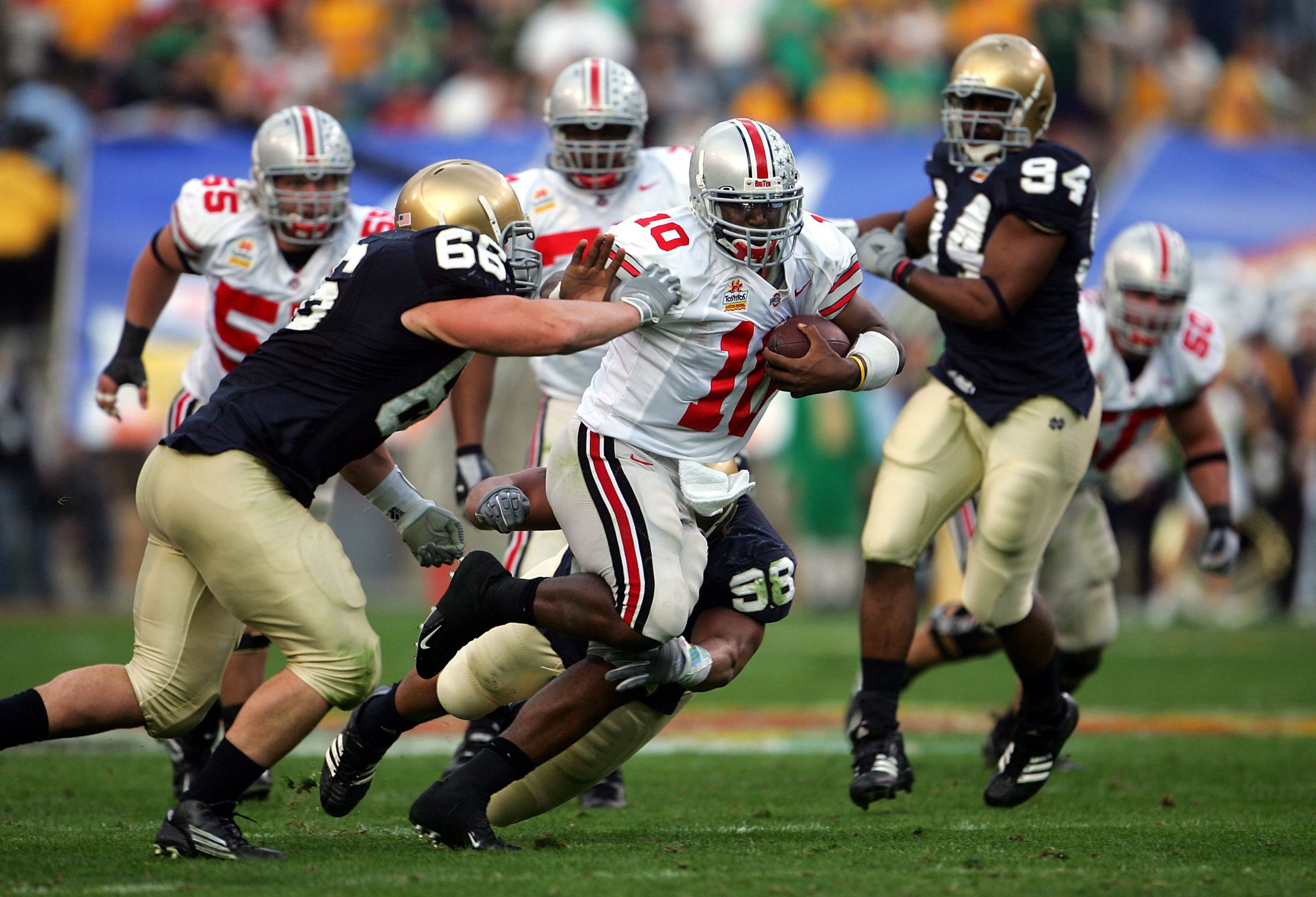 TEMPE, AZ – JANUARY 02: Quarterback Troy Smith #10 of the Ohio State Buckeyes is grabbed as he tries to run by Derek Landri #66 and Trevor Laws #98 of the Notre Dame Fighting Irish at the Tostito’s Fiesta Bowl at the Sun Devil Stadium on January 2, 2006 in Tempe, Arizona. (Photo by Jeff Gross/Getty Images)
