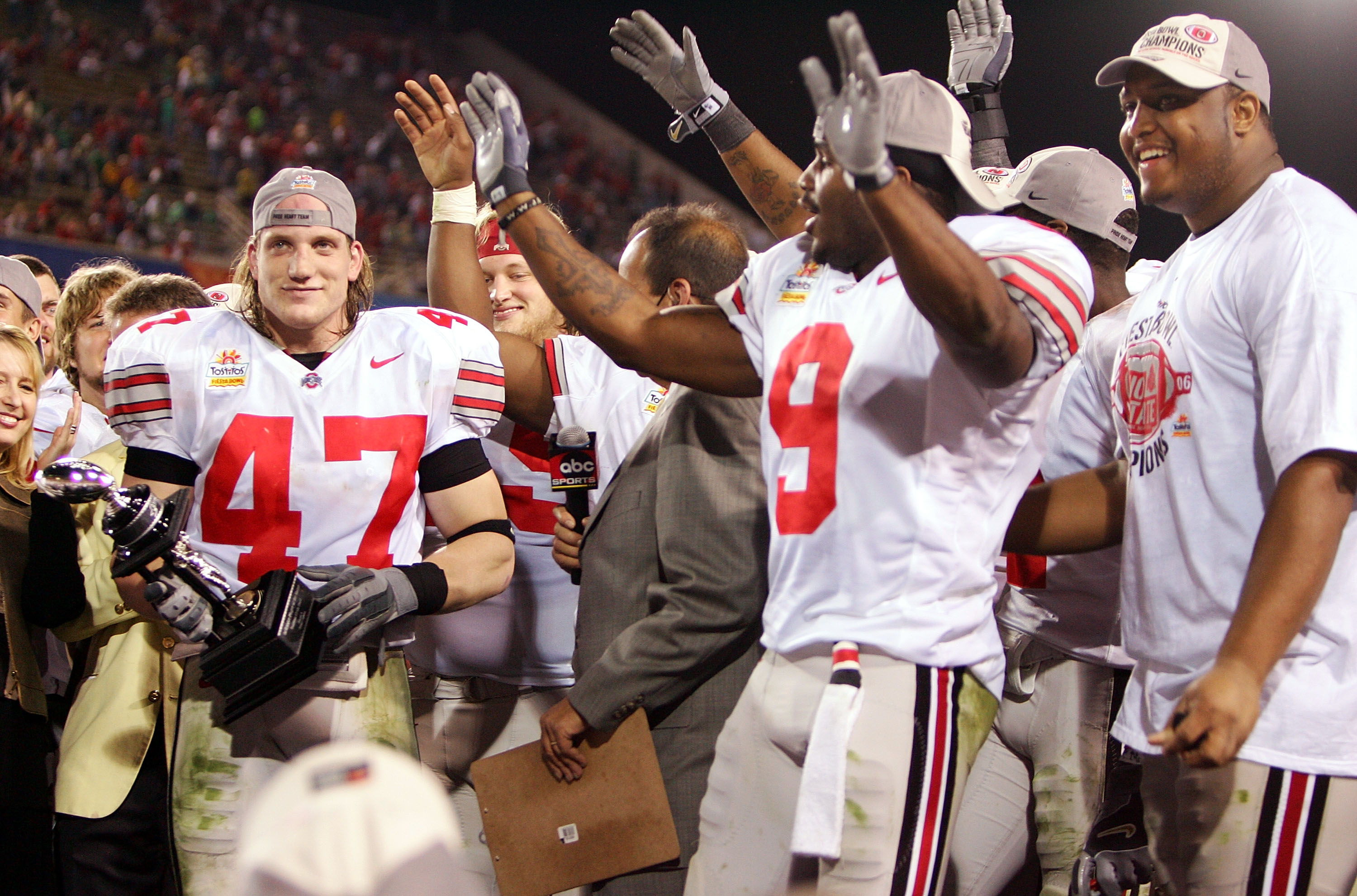 TEMPE, AZ – JANUARY 02: Linebacker A.J. Hawks #47 of the Ohio State Buckeyes holds his defensive player of the game award as his teammates cheer after the Buckeyes defeated the Notre Dame Fighting Irish in the Tostito’s Fiesta Bowl at Sun Devil Stadium on January 2, 2006 in Tempe, Arizona. The Buckeyes defeated the Fighting Irish 34-20. (Photo by Jeff Gross/Getty Images)