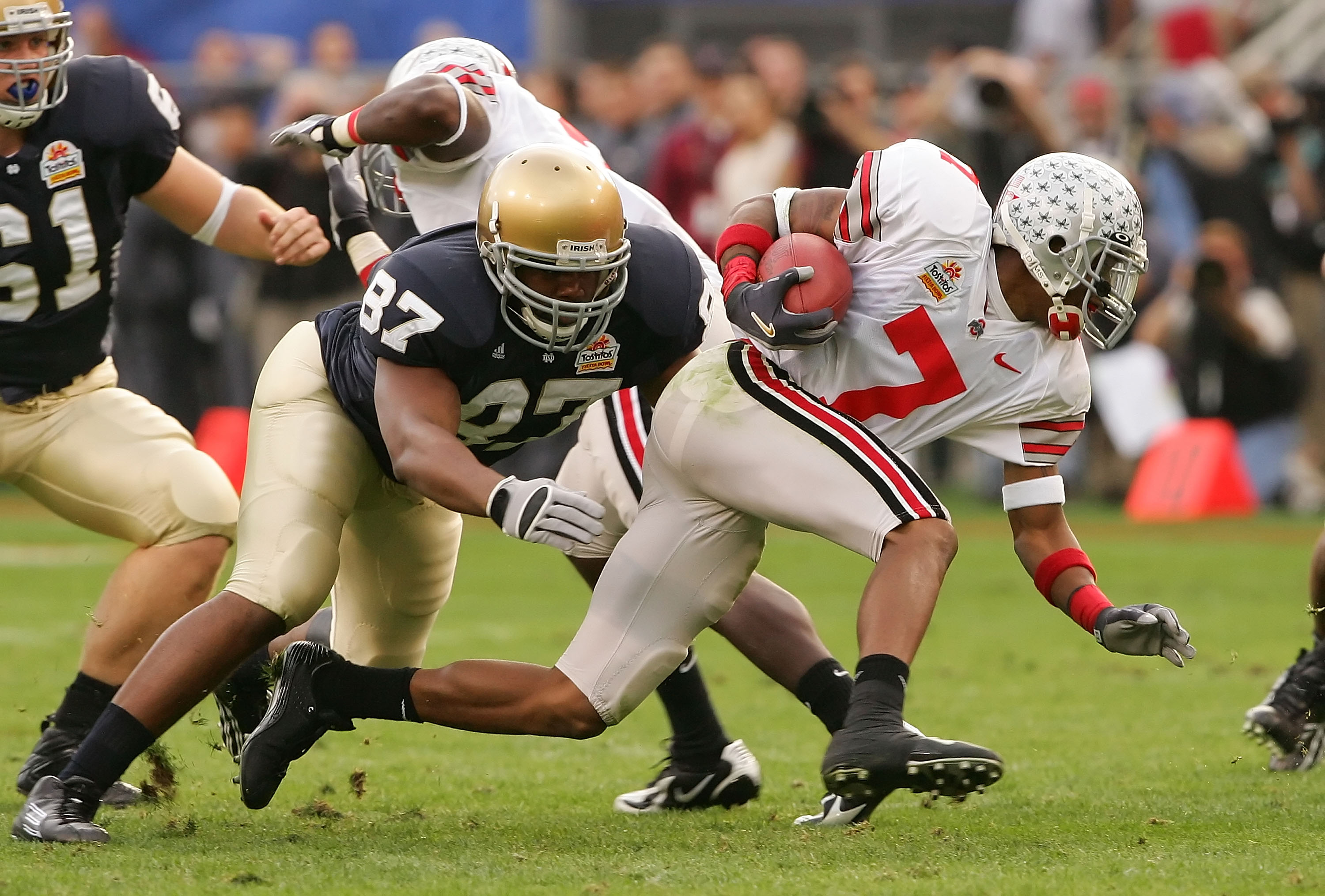 TEMPE, AZ – JANUARY 02: Wire receiver/kick returner Ted Ginn Jr. #7 of the Ohio State Buckeyes looks to break a tackle by Marcus Freeman #87 of the Notre Dame Fighting Irish in the Tostito’s Fiesta Bowl at Sun Devil Stadium on January 2, 2006 in Tempe, Arizona. The Buckeyes defeated the Fighting Irish 34-20. (Photo by Lisa Blumenfeld/Getty Images)