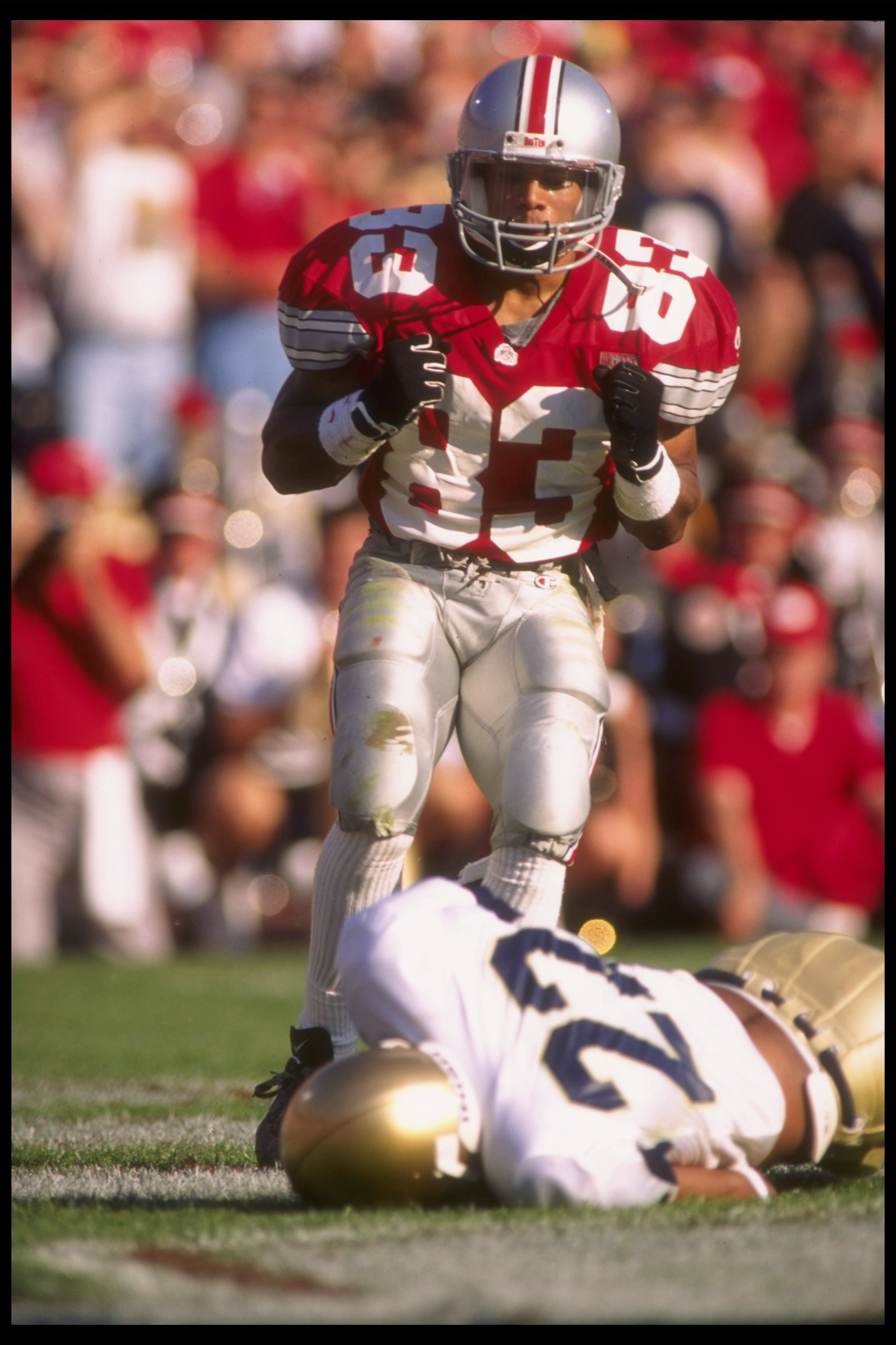 30 Sep 1995: Terry Glenn of the Ohio State Buckeyes stands over Shawn Wooden of the Notre Dame Fighting Irish during a game at Ohio Stadium in Columbus, Ohio. Ohio State won the game, 45-26. Mandatory Credit: Andy Lyons /Allsport