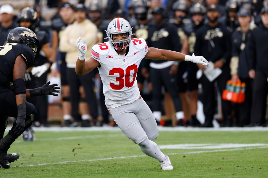 WEST LAFAYETTE, IN - OCTOBER 14: Ohio State Buckeyes linebacker Cody Simon (30) rushes on defense during a college football game against the Purdue Boilermakers on October 14, 2023 at Ross-Ade Stadium in West Lafayette, Indiana. (Photo by Joe Robbins/Icon Sportswire via Getty Images)