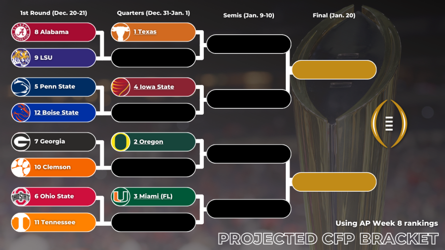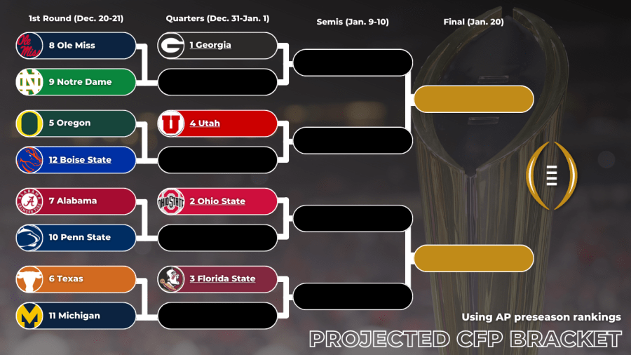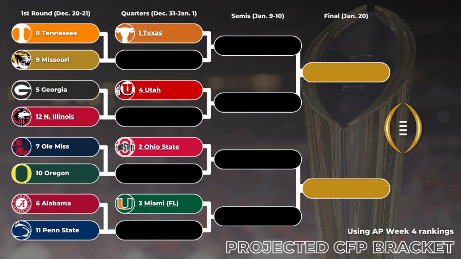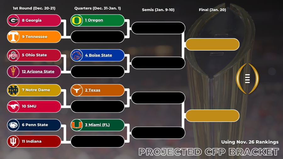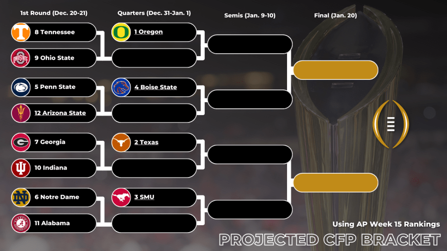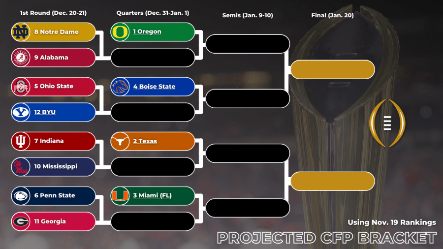Tuesday’s penultimate playoff rankings announcement will likely keep Ohio State in playoff position and could have them go on the road for a first round game on Dec. 20 or 21. Using the Week 15 rankings, the Buckeyes would travel to play at Tennessee in the first round with the winner facing Oregon in the Rose Bowl on New Year’s Day.