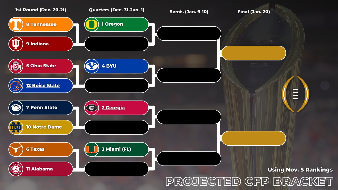 Instead, they sit as the five-seed and would play a first-round game on Dec. 20 or 21 at Ohio Stadium if they are still in that position when the final rankings are revealed on Dec. 8. Using the Nov. 5 poll, Ohio State would play Boise State, with the winner meeting BYU in a quarterfinal at the Fiesta Bowl in Glendale, Arizona.