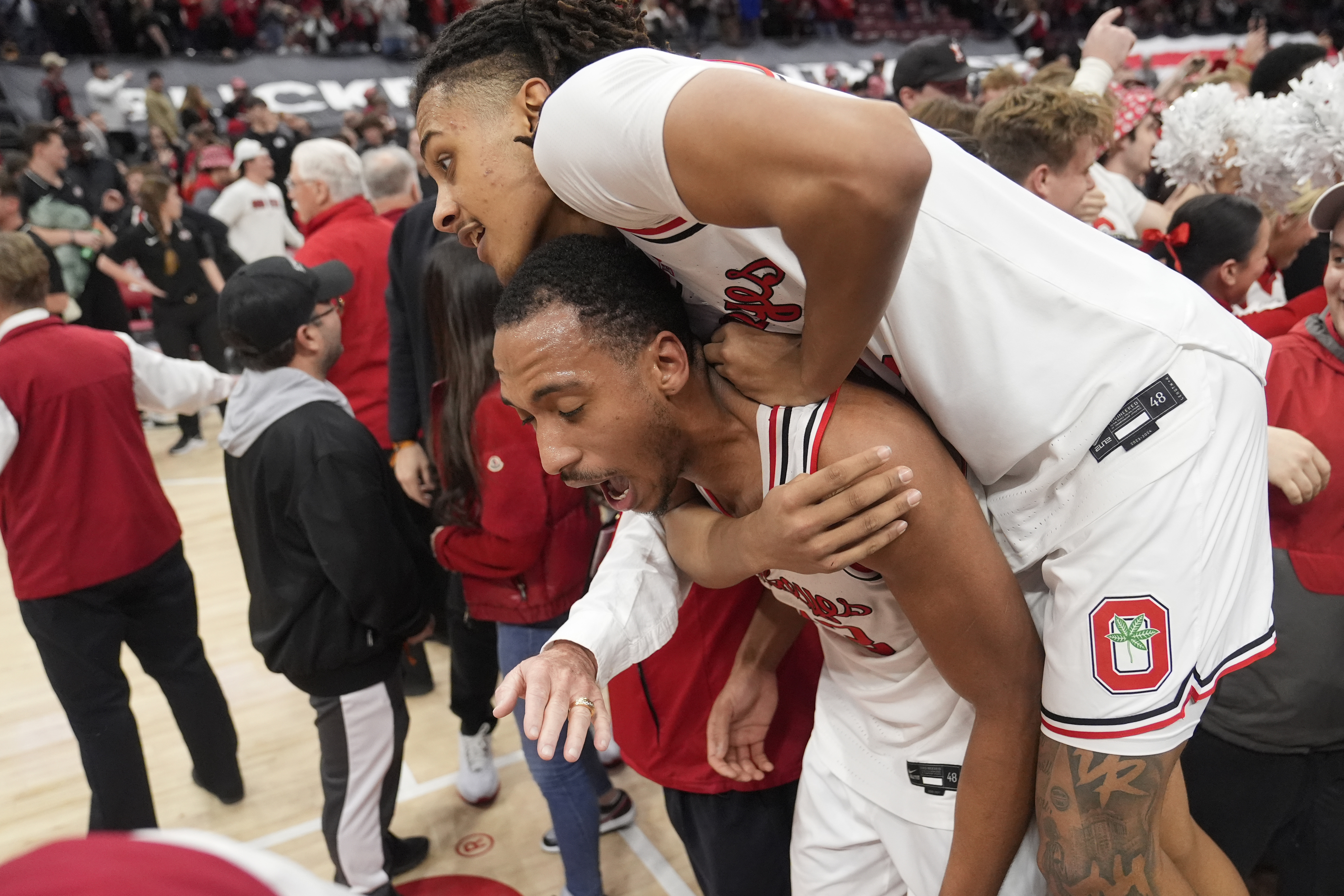 Ohio State forward Devin Royal, right, and forward Zed Key, left, celebrate after Ohio State defeated Purdue in an NCAA college basketball game, Sunday, Feb. 18, 2024, in Columbus, Ohio. (AP Photo/Sue Ogrocki)