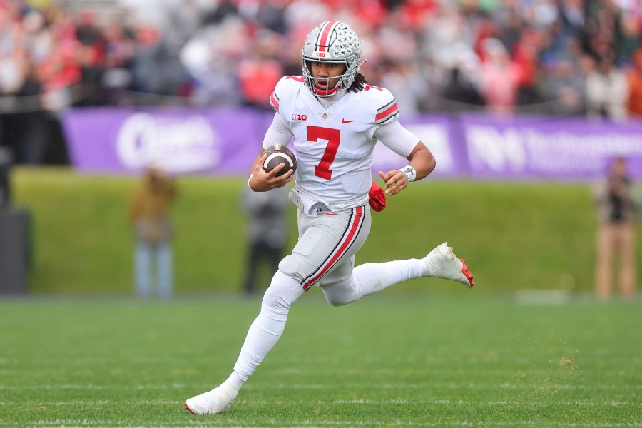 EVANSTON, ILLINOIS - NOVEMBER 05: C.J. Stroud #7 of the Ohio State Buckeyes runs for a first down against the Northwestern Wildcats during the first half at Ryan Field on November 05, 2022 in Evanston, Illinois. (Photo by Michael Reaves/Getty Images)